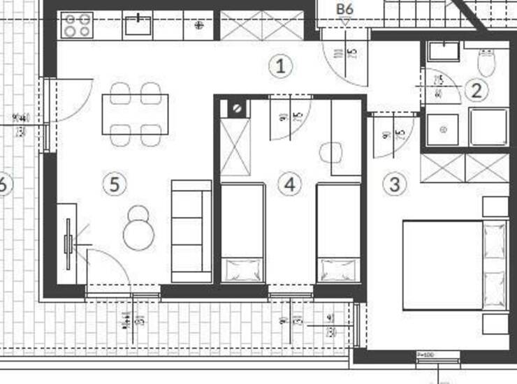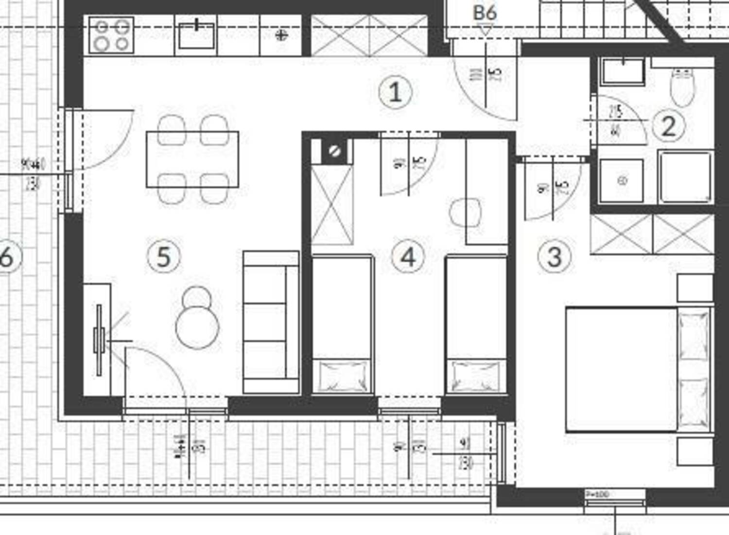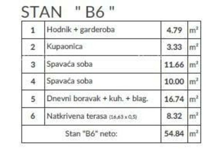 Stan B6, površine 54.84 m2, nalazi se na 1 katu zgrade i sastoji se od: hodnik+garderoba, dnevni boravak sa kuhinjom i blagovaonicom, 2 spavaće sobe, kupatila i natkrivene terase.