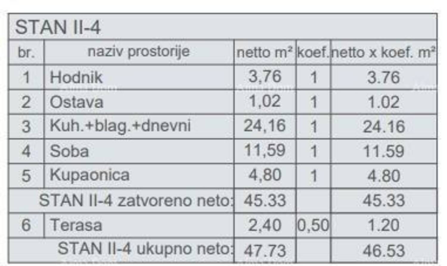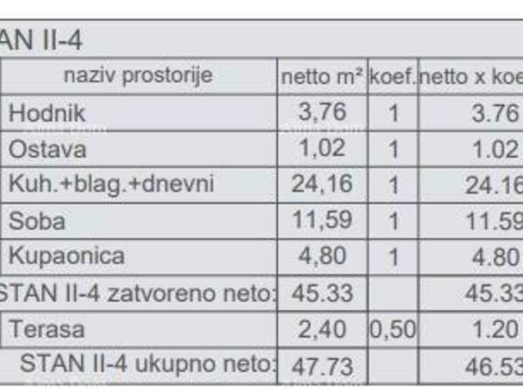 Stan II-4, nalazi se na 2. katu zgrade, ukupne kvadrature 47.73 (netto 46.53 m2), a sastoji se od: hodnika, kuhinje, dnevnog boravka i blagovaonice, ostave, 1 spavaće sobe, kupaonice i terase. Grijanje/hlađenje stana će biti osigurano uz klima uređaje Mitsubishi i podno grijanje.