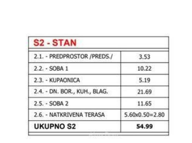 Stan uključuje predprostor, 2 spavaće sobe, kupaonu, kuhinju s dnevnim boravkom i blagovaonom i natkrivenu terasu.