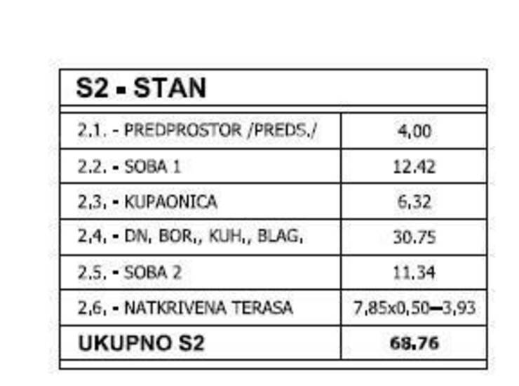 Stan površine 68.76 m2, uključuje predprostor, 2 spavaće sobe, kupaonu, kuhinju s dnevnim boravkom i blagovaonom i natkrivenu terasu.
