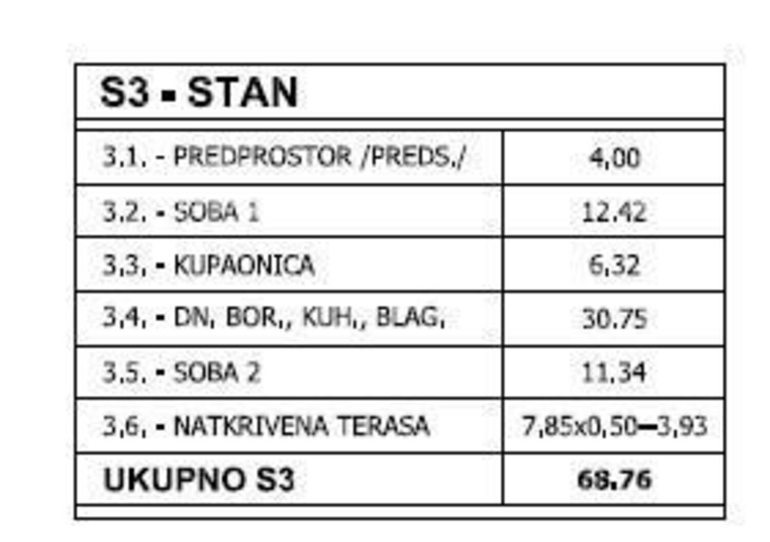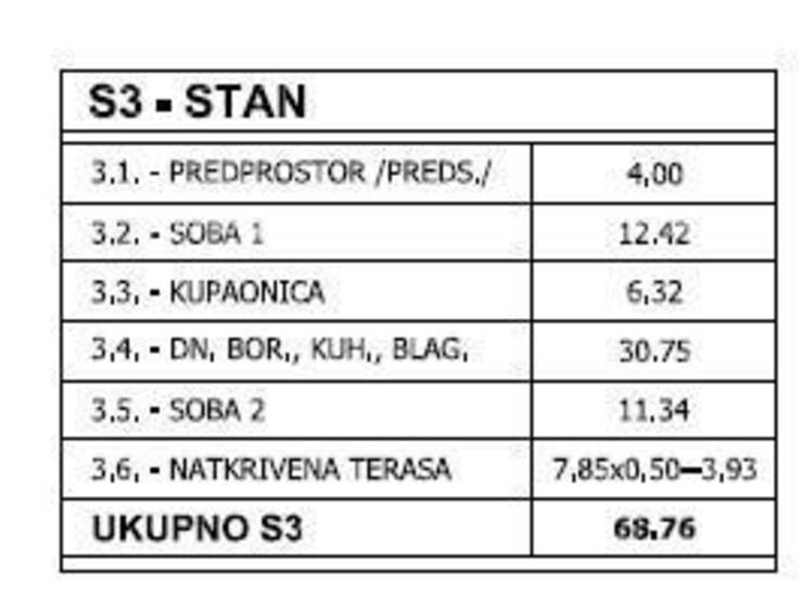 Stan površine 68.76 m2, uključuje predprostor, 2 spavaće sobe, kupaonu, kuhinju s dnevnim boravkom i blagavaonom i natkrivenu terasu.