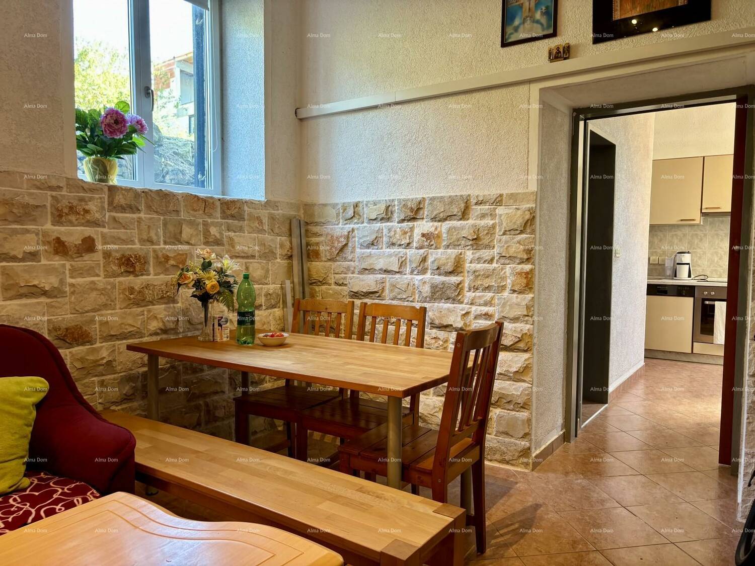 U kuhinji je predviđena zamjena prozora za staklena vrata, čime bi se omogućio izlaz na zajedničku terasu od cca 100 m². Na terasi su dva seta stolova i stolica, peć za roštilj, masline i cvijeće – ugodno i zeleno okruženje.