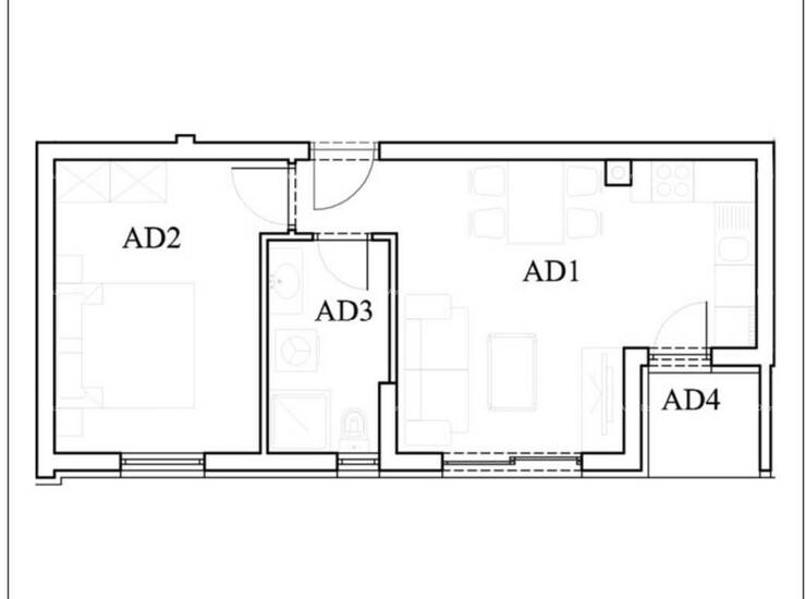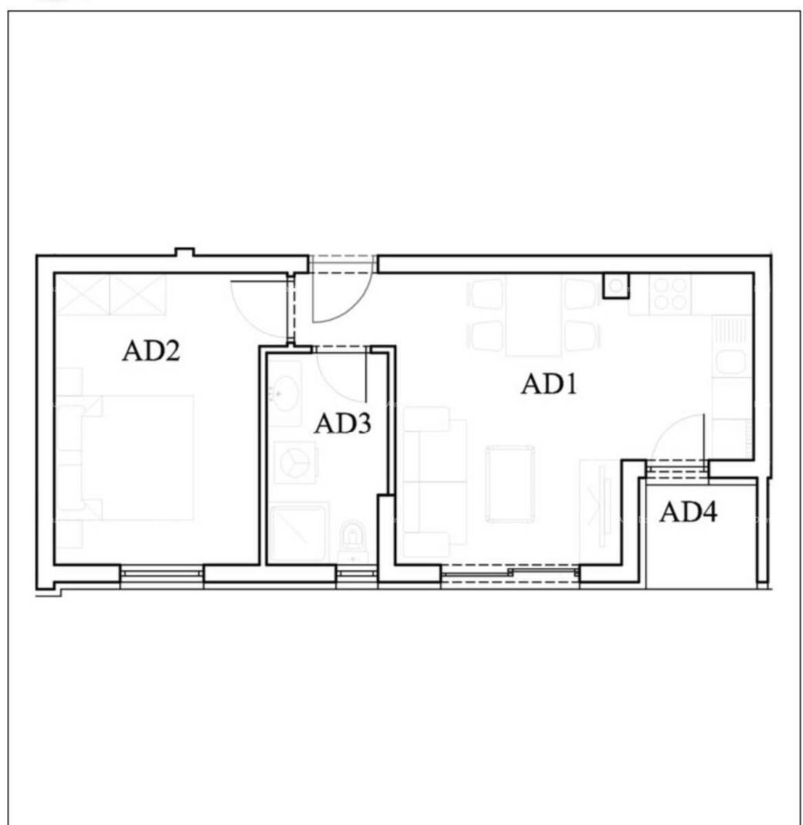 Stan AD se nalazi u prizemlju zgrade, ima površinu 39.97 m2 i sastoji se od kuhinji, dnevnog boravka, spavaće sobe i kupaonice.