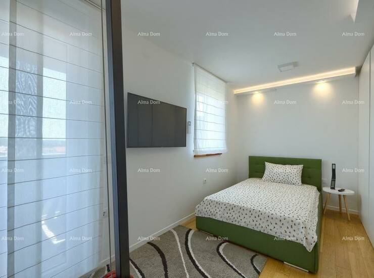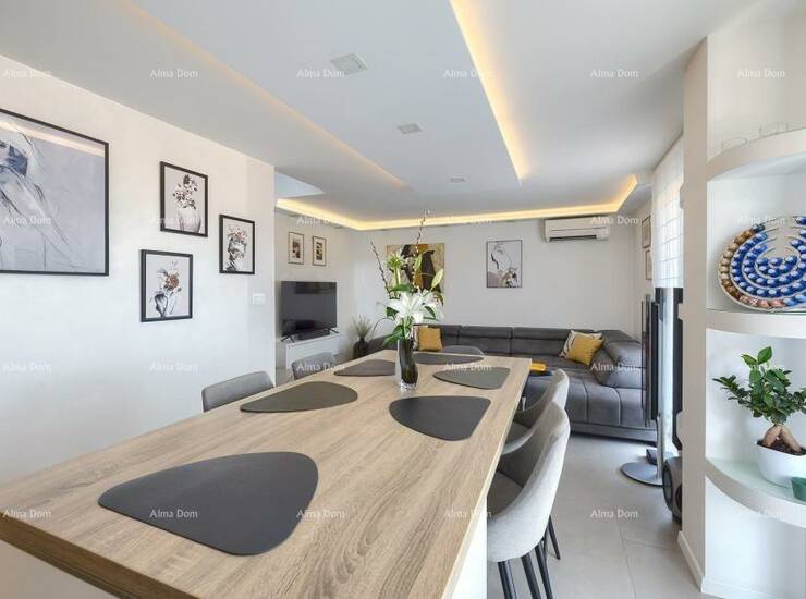 Opremanje: Stan je opremljen visokokvalitetnim namještajem i sanitarijama. Kuhinja i garderobni ormari rađeni su po mjeri. Podovi su od kvalitetne keramike i parketa, a vanjska stolarija je PVC sa električnim roletama i komarnicima.