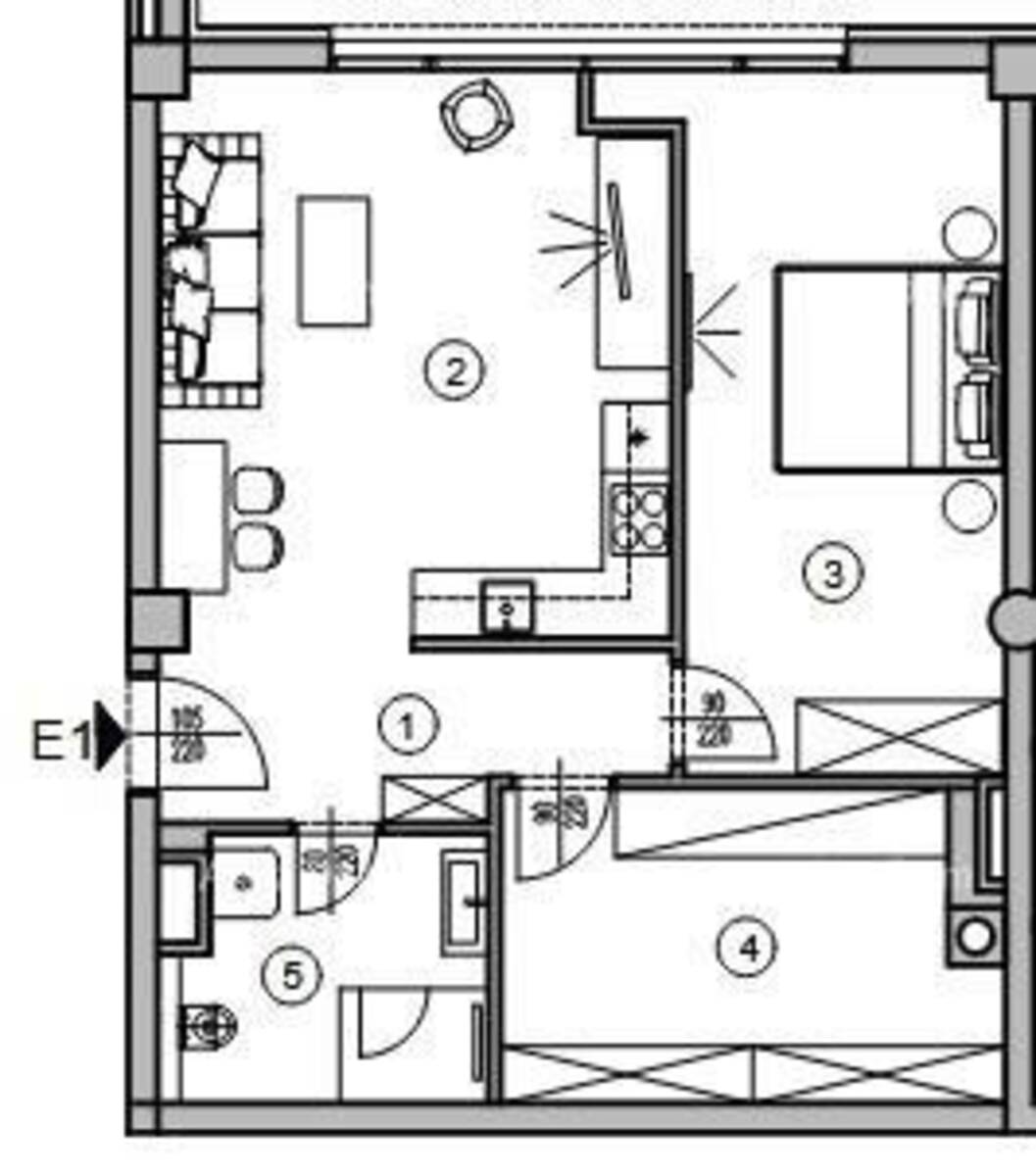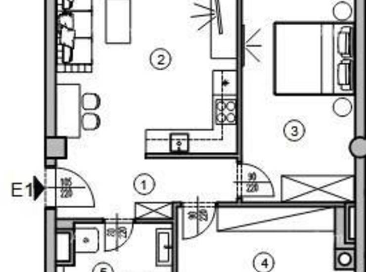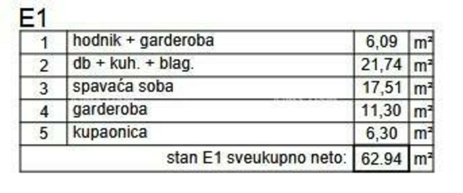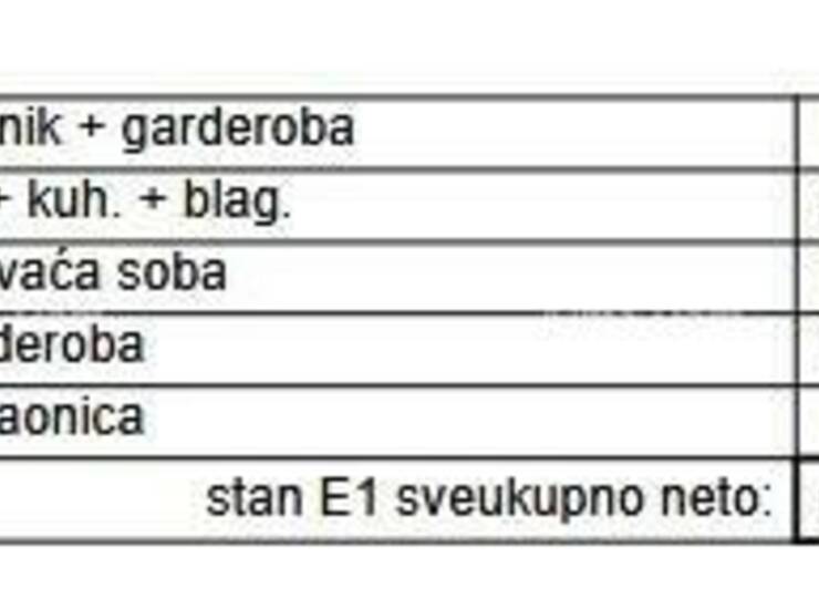 Stan E1, nalazi se na 1.katu stambeno poslovne zgrade i sastoji se od hodnika+ garderobe, dnevnog boravka s kuhinjom i blagavaonom, spavaće sobe, još jedne garderobe i kupaone.