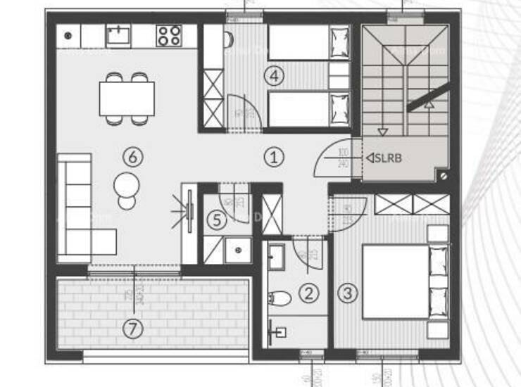 Stan oznake SLRB nalazi se na 1.katu zgrade i sastoji od hodnika, dnevnog boravka s kuhinjom i blagovaonom, 2 spavaće sobe, vešeraja, kupaone i lođe.