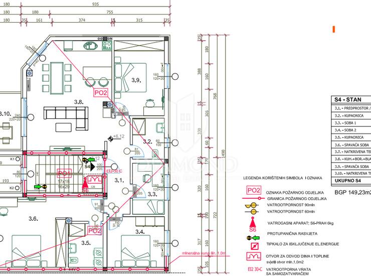 Stan ima iznimno funkcionalan raspored i sastoji se od četiri spavaće sobe, od kojih jedna ima izlaz na natkrivenu terasu, dvije kupaonice, hodnika, te kuhinje s blagovaonicom i dnevnim boravkom iz kojeg se izlazi na drugu terasu. Također stanu pripadaju dva vanjska parkirna mjesta i ostava.