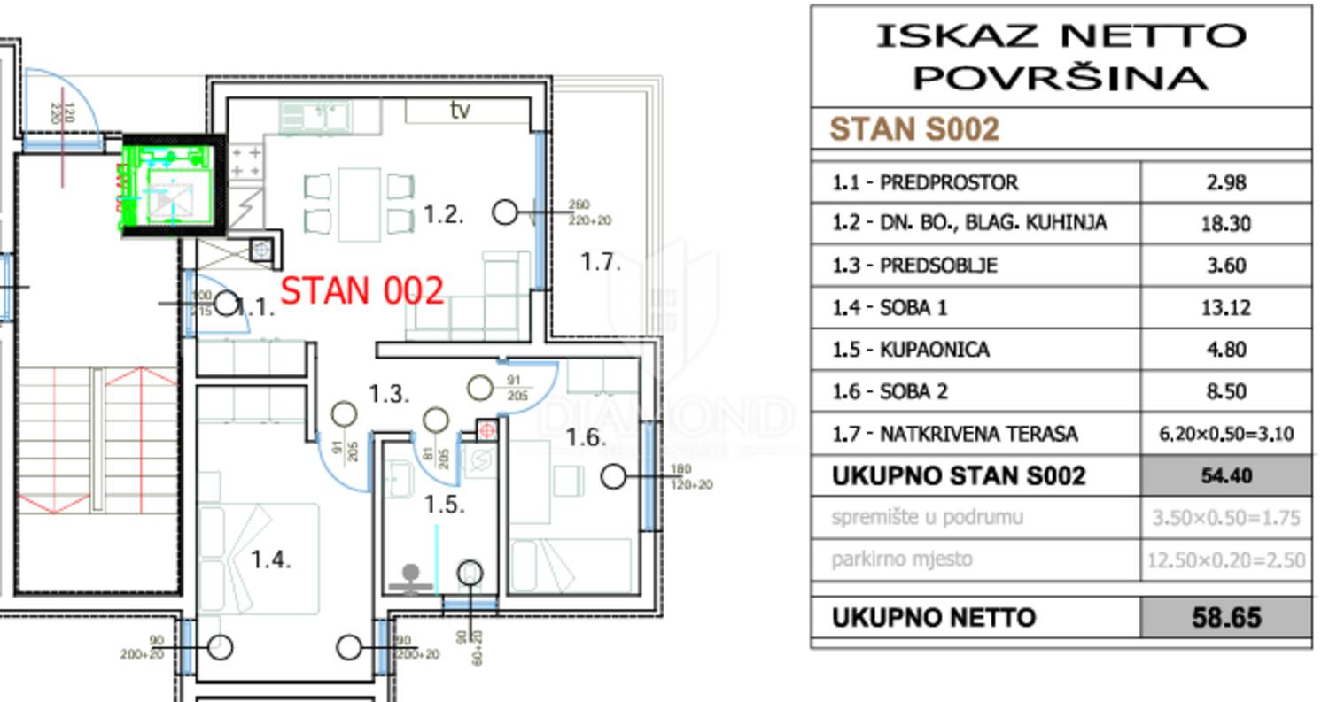 Riječ je o novom, moderno osmišljenom dvosobnom stanu koji spaja funkcionalnost, udobnost i suvremeni način života. Prostor je organiziran kao open space kuhinja, blagovaonica i dnevni boravak koji odiše svjetlošću i prozračnošću, a iz kojeg se izlazi na natkrivenu terasu i privatnu okućnicu od 60 m² – idealan kutak za jutarnju kavu, opuštanje ili druženja na otvorenom.