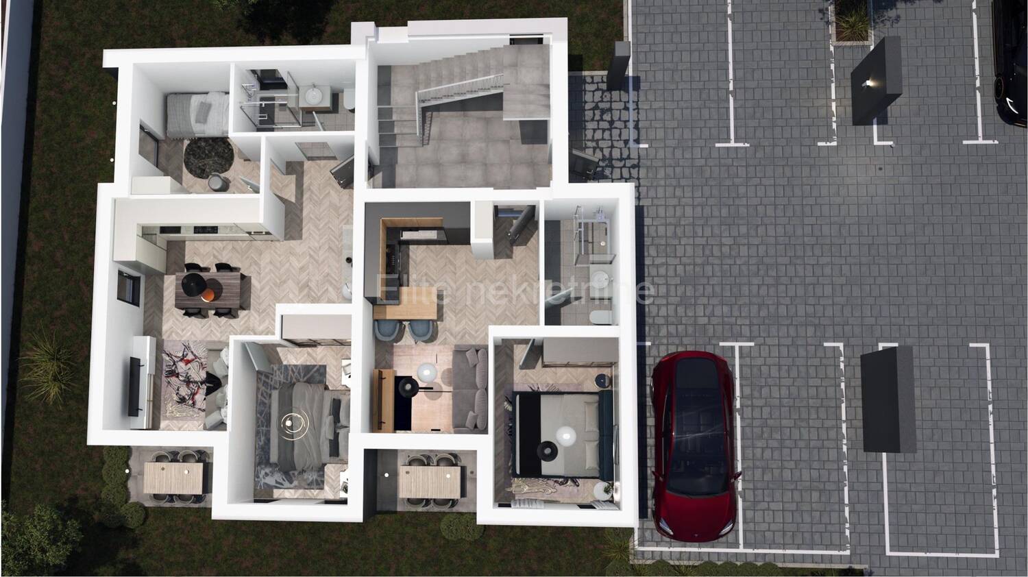 Centralni dio rasporeda stana čini prostrani open space prostor koji objedinjuje kuhinju, dnevni boravak i blagovaonicu. Iz tog prostora izlazi se na privatnu lođu stana, iz koje se dalje pristupa privatnom vrtu površine 97 m2. Stan još ima i dvije spavaće sobe i jednu kupaonicu. Stanu pripada i jedno parkirno mjesto koje se nalazi odmah uz vrt, otvarajući budućem kupcu mogućnost postavljanja natkrivenog parkirnog mjesta.