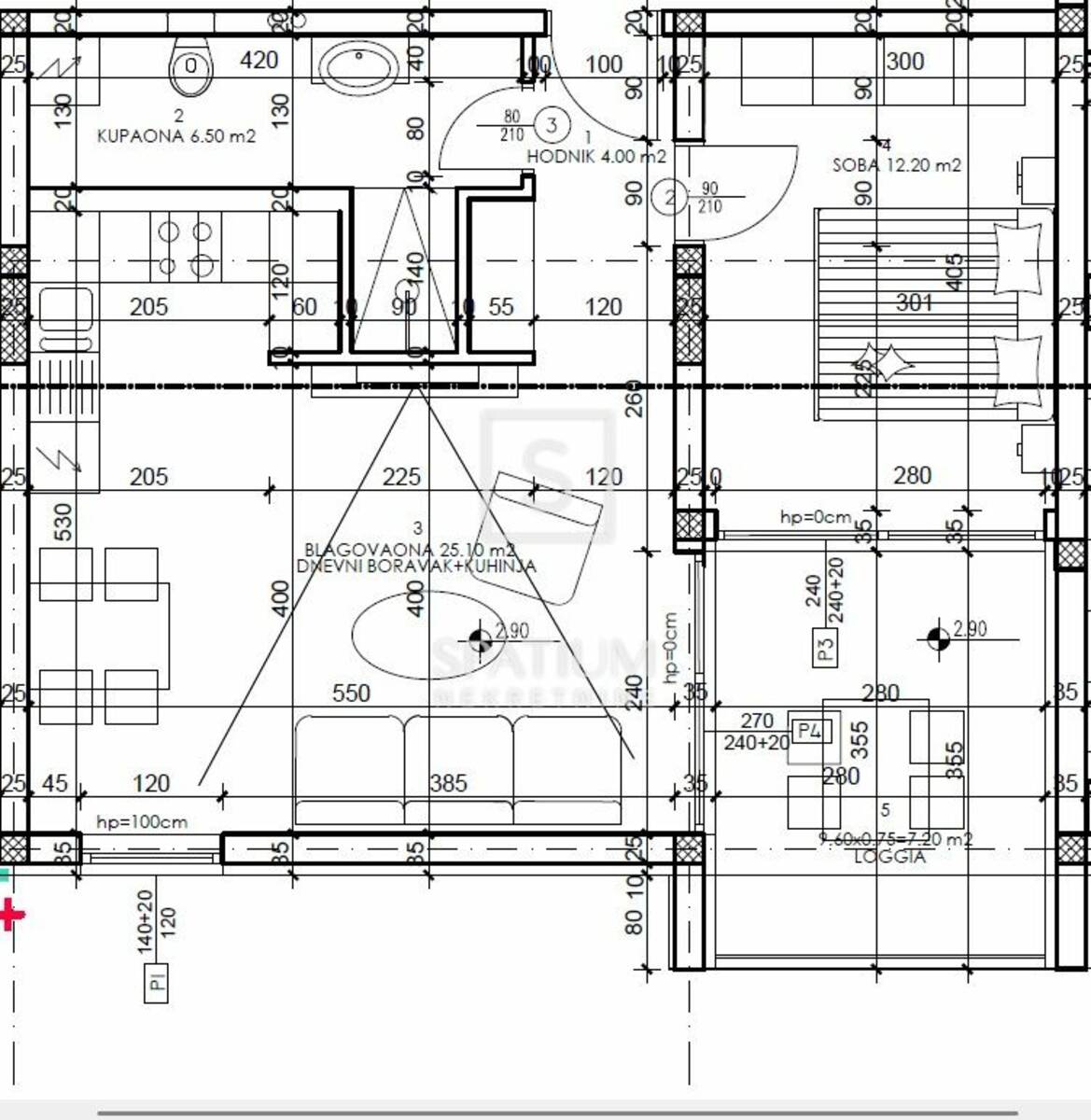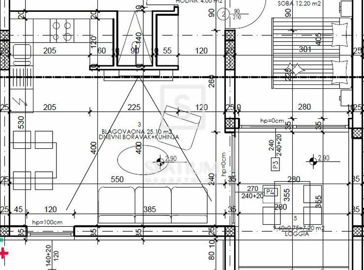 - dnevni boravak, blagovaona i kuhinja 25.10 m2