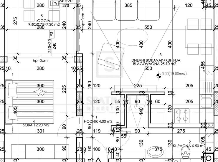 - dnevni boravak, blagovaona i kuhinja 25.10 m2