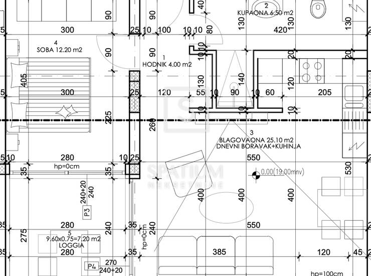 - dnevni boravak, blagovaona i kuhinja 25.10 m2