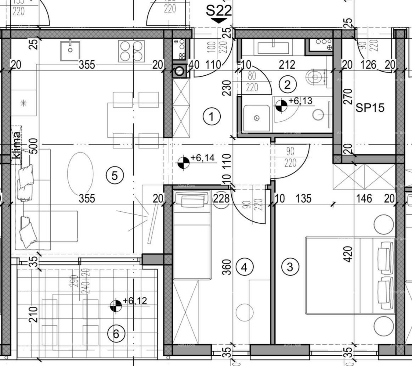 U ponudi je stan na 2. katu višestambene zgrade s liftom. Stan će se sastojati od ulaznog hodnika, 2 spavaće sobe, kupaonice, kuhinje s blagavaonom te dnevnim boravkom i terasom natkrivenom 6 m2.