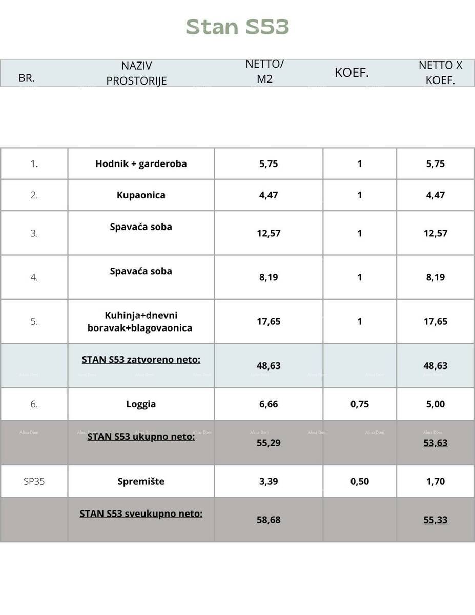 U ponudi je stan na 4. katu višestambene zgrade s liftom. Stan će se sastojati od ulaznog hodnika+garderoba, 2 spavaće sobe, kupaonice, kuhinje s blagavaonom te dnevnim boravkom i loggia-om.