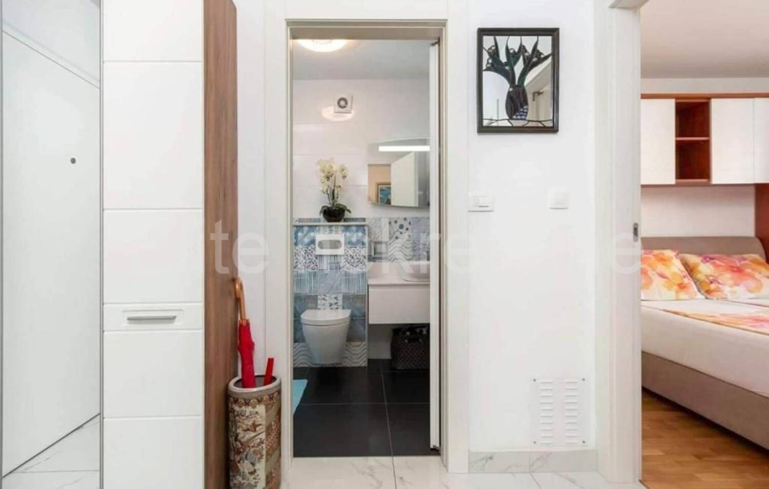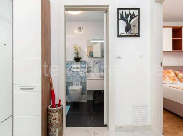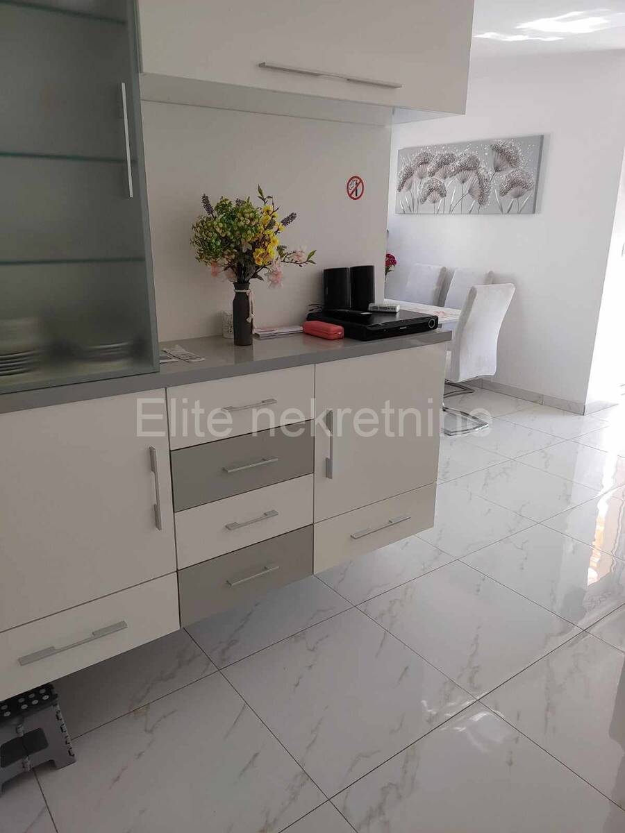 Sadrži: ulazni hodnik, kuhinju s blagovaonicom i dnevnim boravkom, dvije spavaće sobe, kupaonicu i terasu s djelomičnim pogledom na more. Stan je potpuno novouređen i opremljen.U podrumu zgrade je pripadajuća ostava, parking ispred zgrade.Stan je opremljen podnim grijanjem, klima uređajem, protuprovalnim vratima, kvalitetnom PVC stolarijom.Uredna dokumentacija.