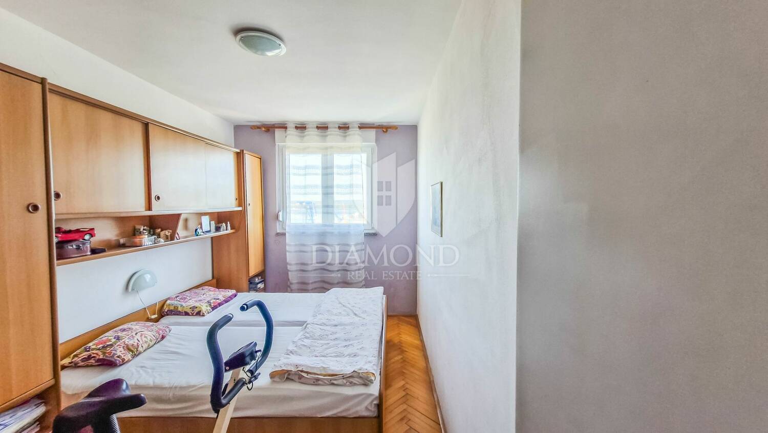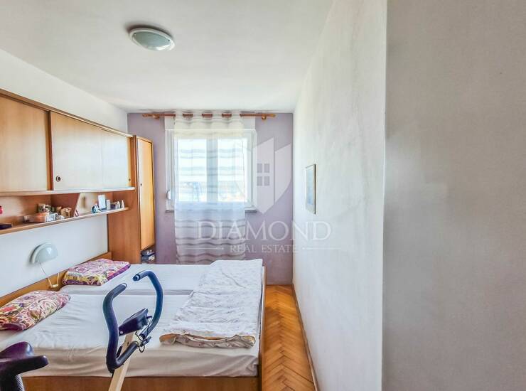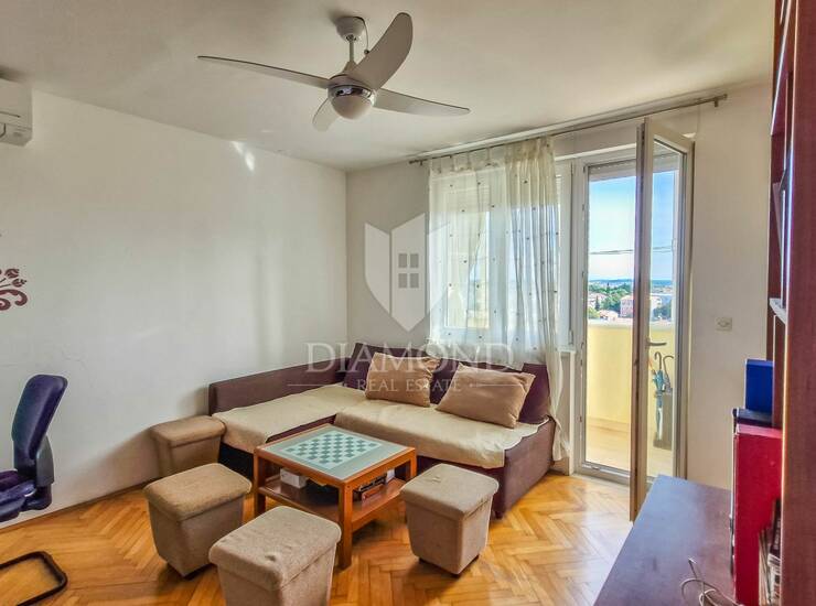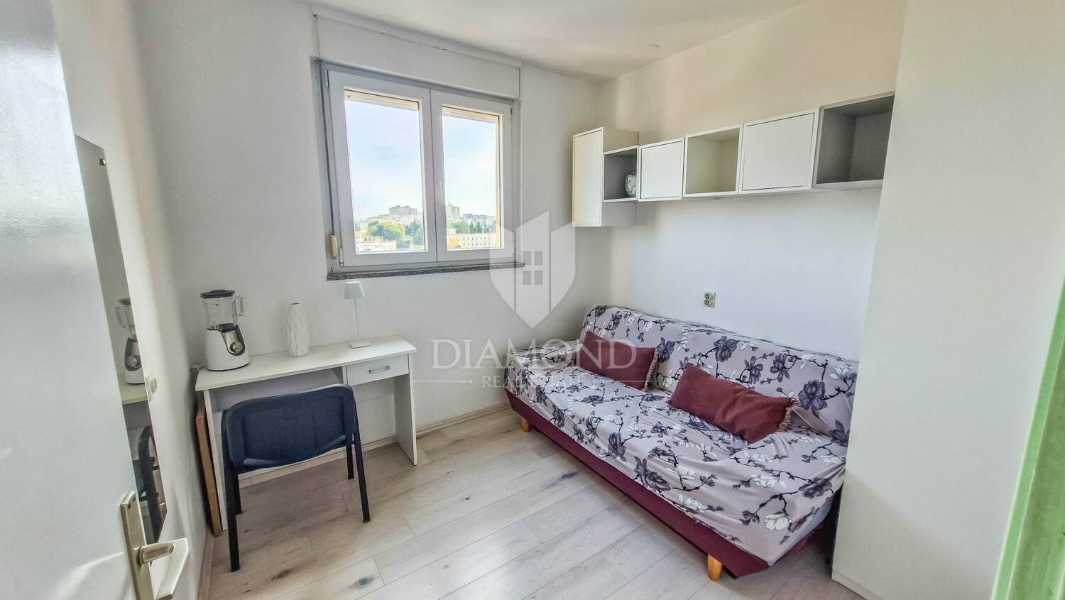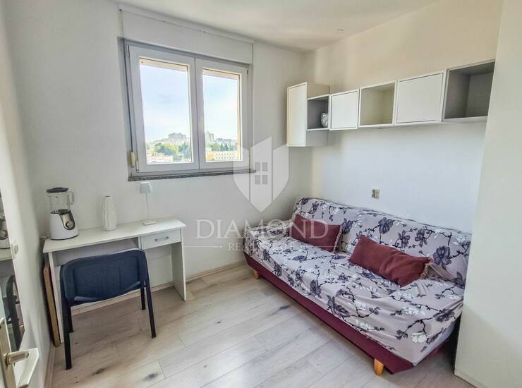 Stan se nalazi na 12. katu zgrade s dva lifta i prekrasnim panoramskim pogledom na more i grad Pulu. Zgrada ima pristup osobama s invaliditetom, a u njoj se nalazi i ordinacija opće prakse , što ovu lokaciju čini dodatno praktičnom za starije osobe i obitelji. Nekretnina se sastoji od dvije spavaće sobe, kuhinje s blagovaonicom, prostranog dnevnog boravka, kupaonice s kadom i hodnika. Balkon je zatvoren PVC stijenama, što omogućuje korištenje prostora tijekom cijele godine uz pogled koji unosi svjetlost i osjećaj prostranosti. Dnevni boravak krasi parket, dok su u kuhinji postavljene pločice. Stan je opremljen klimom i termo peći za grijanje, a PVC stolarija osigurava dobru toplinsku izolaciju.