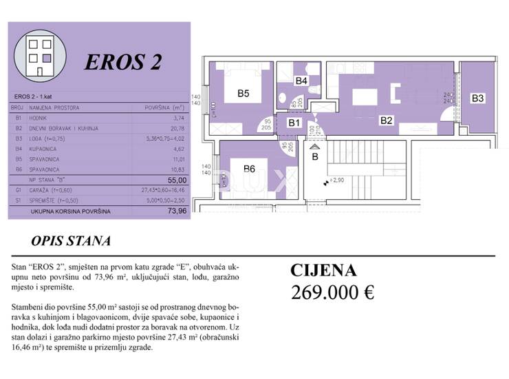 Projekt predviđa četiri stana po svakom objektu s kvadraturama između 60m2 i 88m2 - dva na prvom, dva na drugom katu. Efikasnim rasporedom prostorija, svaki stan imat će dvije spavaće sobe, prostranu kuhinju s dnevnim boravkom, kupaonicu i lođu.
