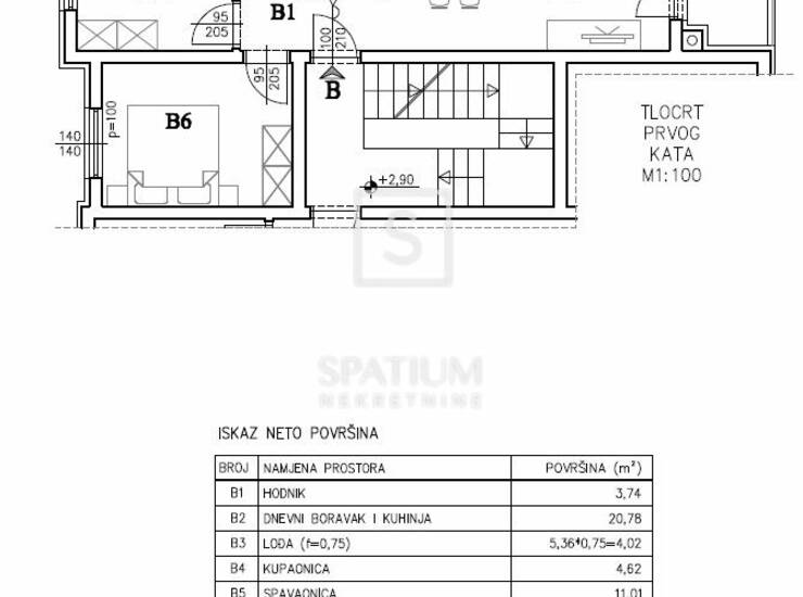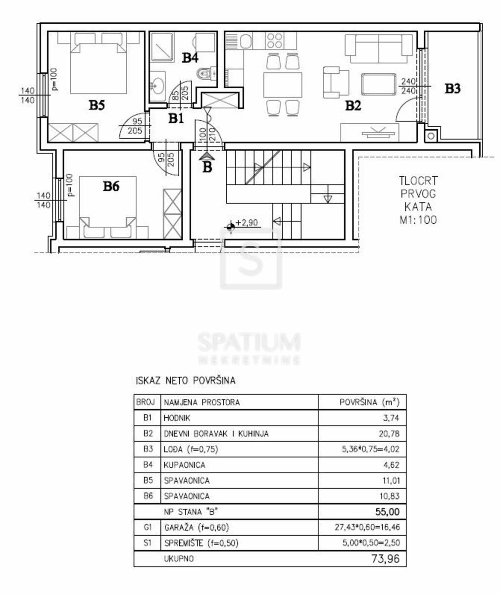 Stan se nalazi na prvom katu zgrade, ukupne neto površine od 73,93 m², uključujući stambeni dio, lođu, garažno parkirno mjesto i spremište u prizemlju. Stambena površina od 55 m² sastoji se od prostranog dnevnog boravka povezanog s kuhinjom i blagovaonicom, dvije spavaće sobe, kupaonice i hodnika, dok lođa pruža ugodan vanjski prostor za opuštanje. Stan je projektiran s naglaskom na optimalan raspored prostorija, obilje prirodnog svjetla i visoku razinu komfora, čineći ga idealnim za obiteljski život, ali i kao investiciju za dugoročni najam.