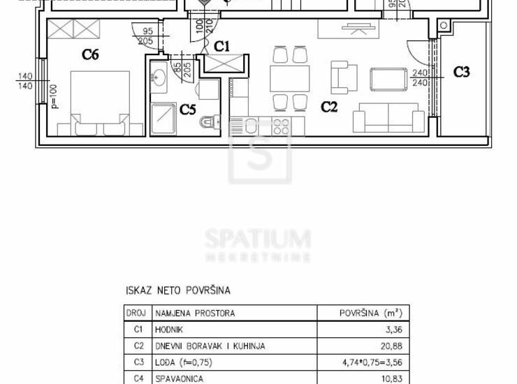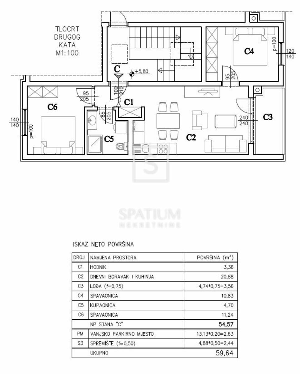 Stan se nalazi na drugom katu zgrade, ukupne neto površine od 59,64 m², uključujući stambeni dio, lođu, vanjsko parkirno mjesto i spremište u prizemlju. Stambena površina od 54,57 m² sastoji se od prostranog dnevnog boravka povezanog s kuhinjom i blagovaonicom, dvije spavaće sobe, kupaonice i hodnika, dok lođa pruža ugodan vanjski prostor za opuštanje. Stan je projektiran s naglaskom na optimalan raspored prostorija, obilje prirodnog svjetla i visoku razinu komfora, čineći ga idealnim za obiteljski život, ali i kao investiciju za dugoročni najam.