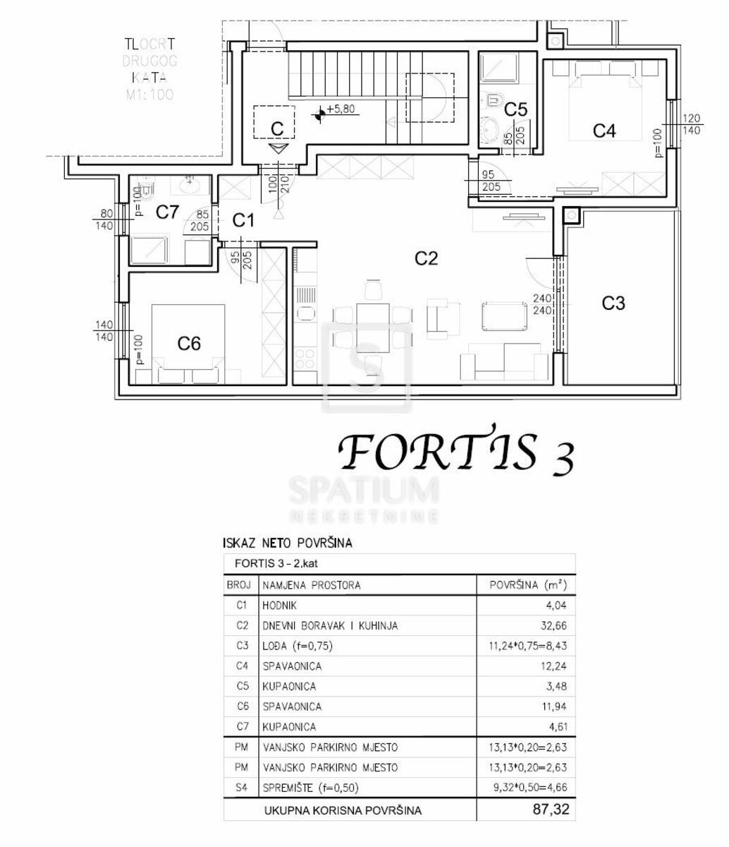 Stan se nalazi na drugom katu zgrade, ukupne neto površine od 87,32 m², uključujući stambeni dio, lođu, vanjsko parkirno mjesto i spremište u prizemlju. Stambena površina od 77,40 m² sastoji se od prostranog dnevnog boravka povezanog s kuhinjom i blagovaonicom, dvije spavaće sobe, dvije kupaonice i hodnika, dok lođa pruža ugodan vanjski prostor za opuštanje. Stan je projektiran s naglaskom na optimalan raspored prostorija, obilje prirodnog svjetla i visoku razinu komfora, čineći ga idealnim za obiteljski život, ali i kao investiciju za dugoročni najam.