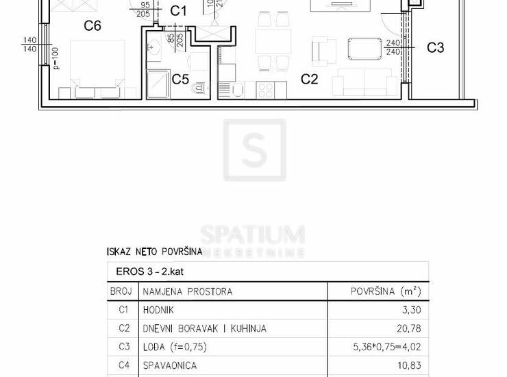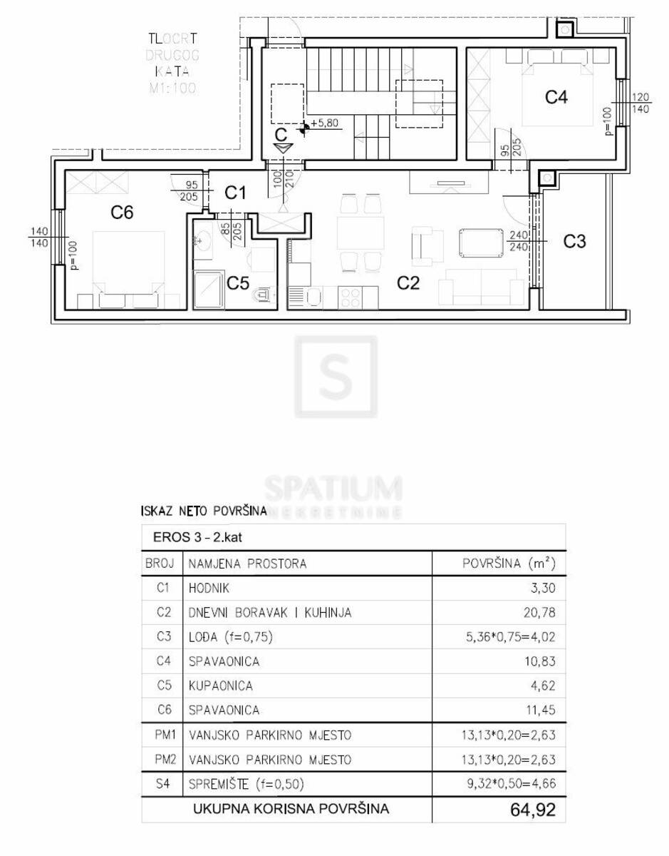 Stan se nalazi na drugom katu zgrade, ukupne neto površine od 64,92 m², uključujući stambeni dio, lođu, vanjsko parkirno mjesto i spremište u prizemlju. Stambena površina od 55 m² sastoji se od prostranog dnevnog boravka povezanog s kuhinjom i blagovaonicom, dvije spavaće sobe, kupaonice i hodnika, dok lođa pruža ugodan vanjski prostor za opuštanje. Stan je projektiran s naglaskom na optimalan raspored prostorija, obilje prirodnog svjetla i visoku razinu komfora, čineći ga idealnim za obiteljski život, ali i kao investiciju za dugoročni najam.