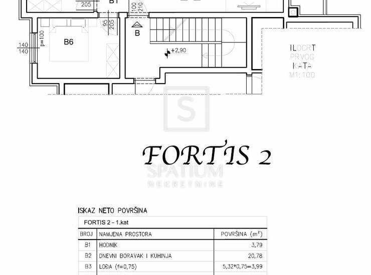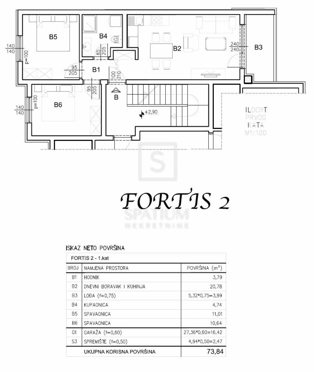 Stan se nalazi na prvom katu zgrade, ukupne neto površine od 73,84 m², uključujući stambeni dio, lođu, garažno parkirno mjesto i spremište u prizemlju. Stambena površina od 54,95 m² sastoji se od prostranog dnevnog boravka povezanog s kuhinjom i blagovaonicom, dvije spavaće sobe, kupaonice i hodnika, dok lođa pruža ugodan vanjski prostor za opuštanje. Stan je projektiran s naglaskom na optimalan raspored prostorija, obilje prirodnog svjetla i visoku razinu komfora, čineći ga idealnim za obiteljski život, ali i kao investiciju za dugoročni najam.