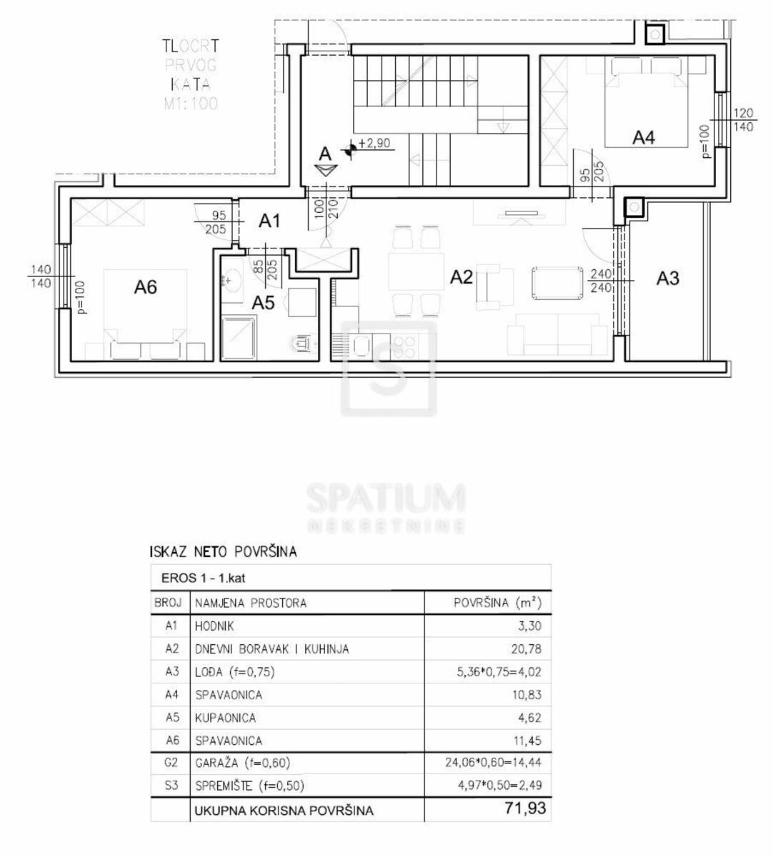Stan se nalazi na prvom katu zgrade, ukupne neto površine od 71,93 m², uključujući stambeni dio, lođu, garažno parkirno mjesto i spremište u prizemlju. Stambena površina od 55 m² sastoji se od prostranog dnevnog boravka povezanog s kuhinjom i blagovaonicom, dvije spavaće sobe, kupaonice i hodnika, dok lođa pruža ugodan vanjski prostor za opuštanje. Stan je projektiran s naglaskom na optimalan raspored prostorija, obilje prirodnog svjetla i visoku razinu komfora, čineći ga idealnim za obiteljski život, ali i kao investiciju za dugoročni najam.