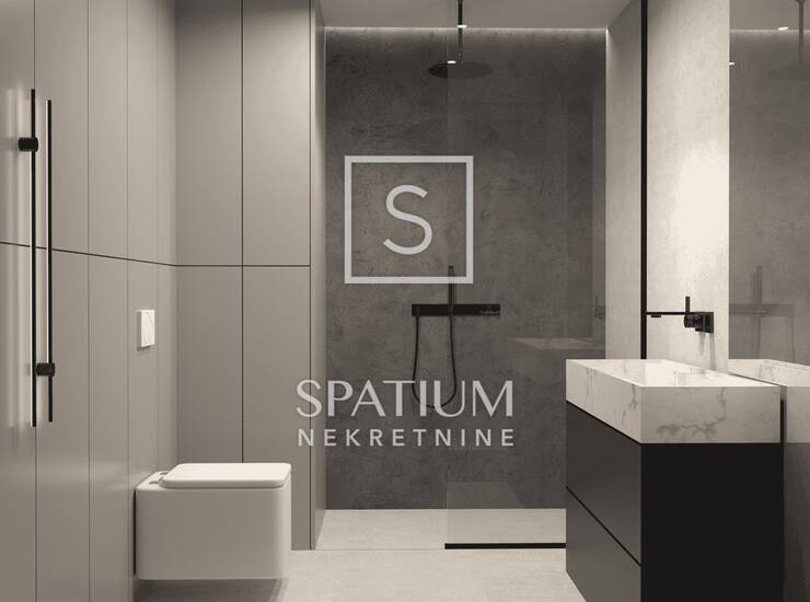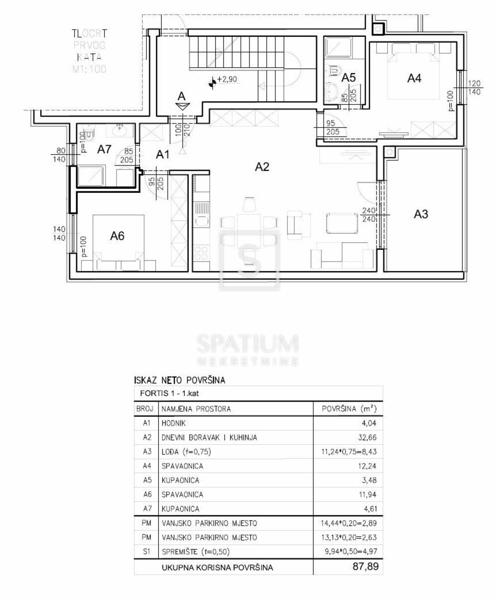 Stan se nalazi na prvom katu zgrade, ukupne neto površine od 87,89 m², uključujući stambeni dio, lođu, dva parkirna mjesta i spremište u prizemlju. Stambena površina od 77,40 m² sastoji se od prostranog dnevnog boravka povezanog s kuhinjom i blagovaonicom, dvije spavaće sobe, kupaonice i hodnika, dok lođa pruža ugodan vanjski prostor za opuštanje. Stan je projektiran s naglaskom na optimalan raspored prostorija, obilje prirodnog svjetla i visoku razinu komfora, čineći ga idealnim za obiteljski život, ali i kao investiciju za dugoročni najam.