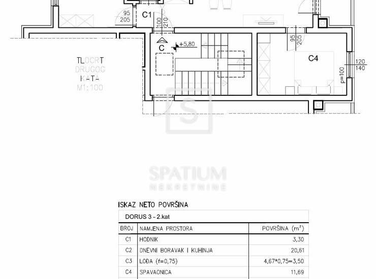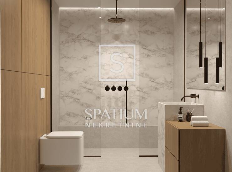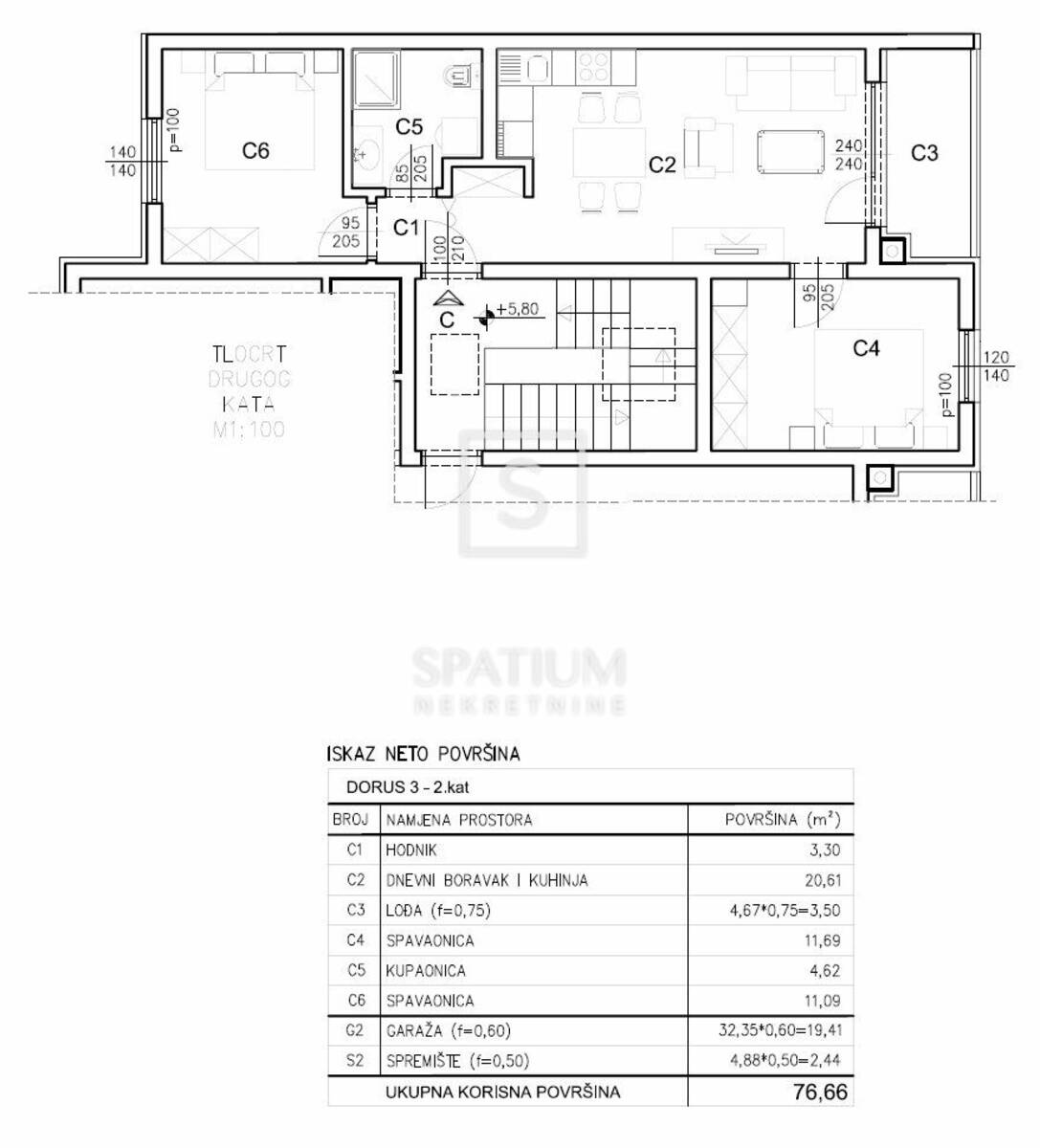 Stan se nalazi na drugom katu zgrade, ukupne neto površine od 76,66 m², uključujući stambeni dio, lođu, garažno parkirno mjesto i spremište u prizemlju. Stambena površina od 54,81 m² sastoji se od prostranog dnevnog boravka povezanog s kuhinjom i blagovaonicom, dvije spavaće sobe, kupaonice i hodnika, dok lođa pruža ugodan vanjski prostor za opuštanje. Stan je projektiran s naglaskom na optimalan raspored prostorija, obilje prirodnog svjetla i visoku razinu komfora, čineći ga idealnim za obiteljski život, ali i kao investiciju za dugoročni najam.