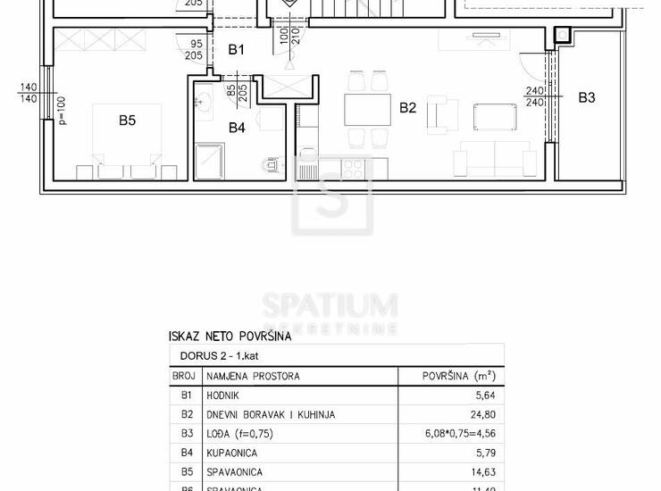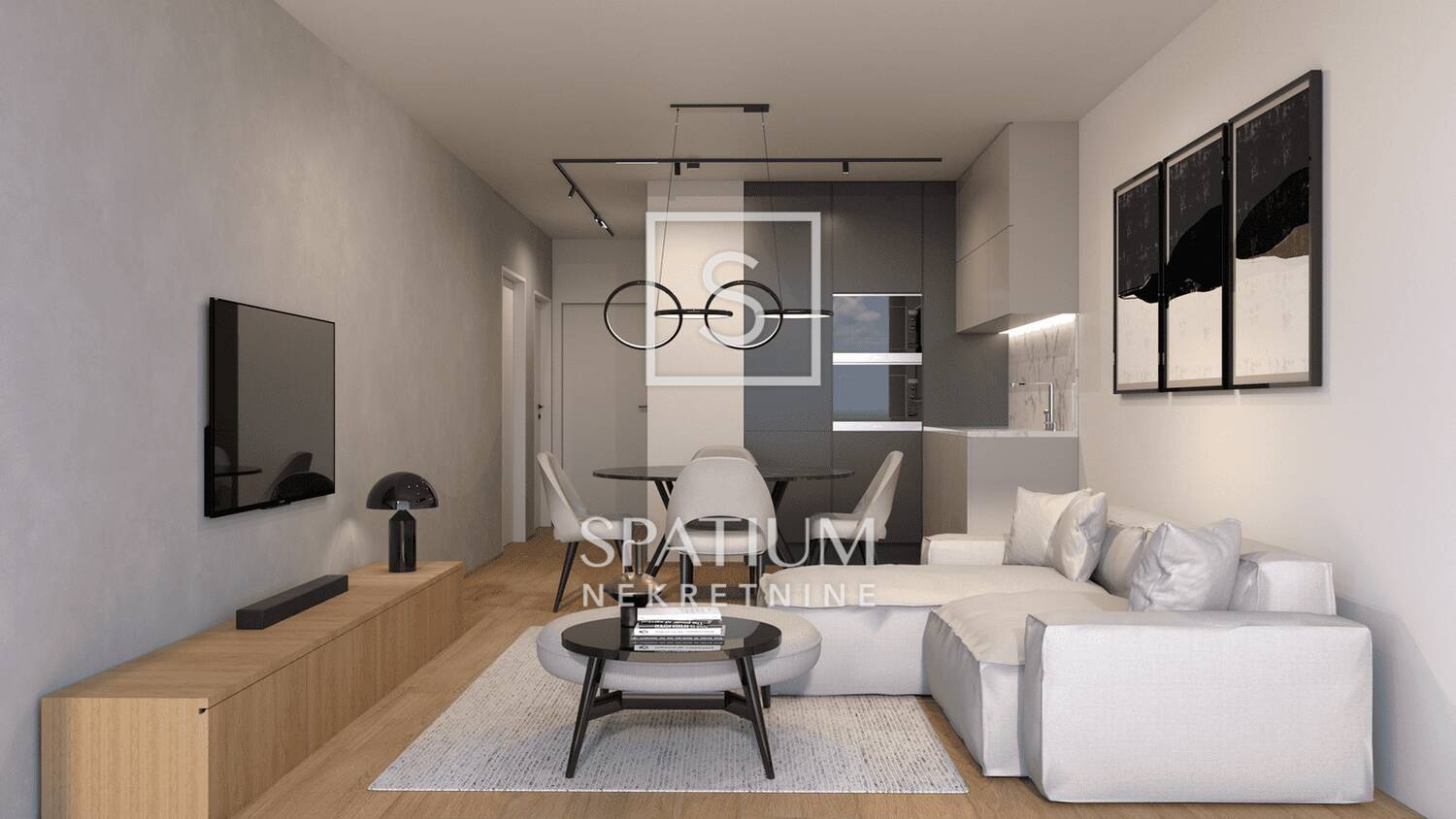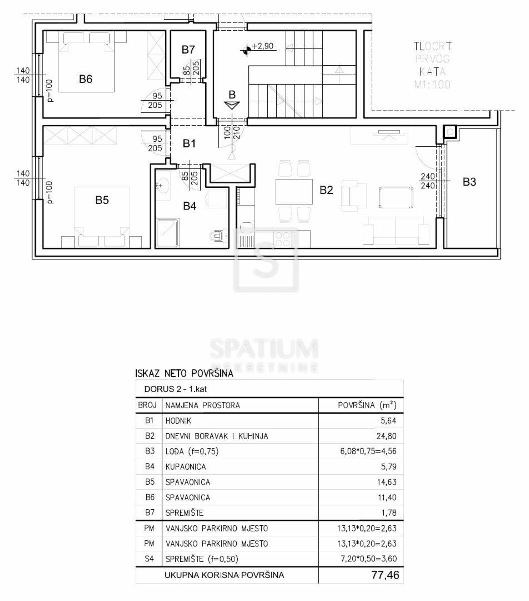 Stan se nalazi na prvom katu zgrade, ukupne neto površine od 77,46 m², uključujući stambeni dio, lođu, dva parkirna mjesta i spremište u prizemlju. Stambena površina od 68,60 m² sastoji se od prostranog dnevnog boravka povezanog s kuhinjom i blagovaonicom, dvije spavaće sobe, kupaonice i hodnika, dok lođa pruža ugodan vanjski prostor za opuštanje. Stan je projektiran s naglaskom na optimalan raspored prostorija, obilje prirodnog svjetla i visoku razinu komfora, čineći ga idealnim za obiteljski život, ali i kao investiciju za dugoročni najam.