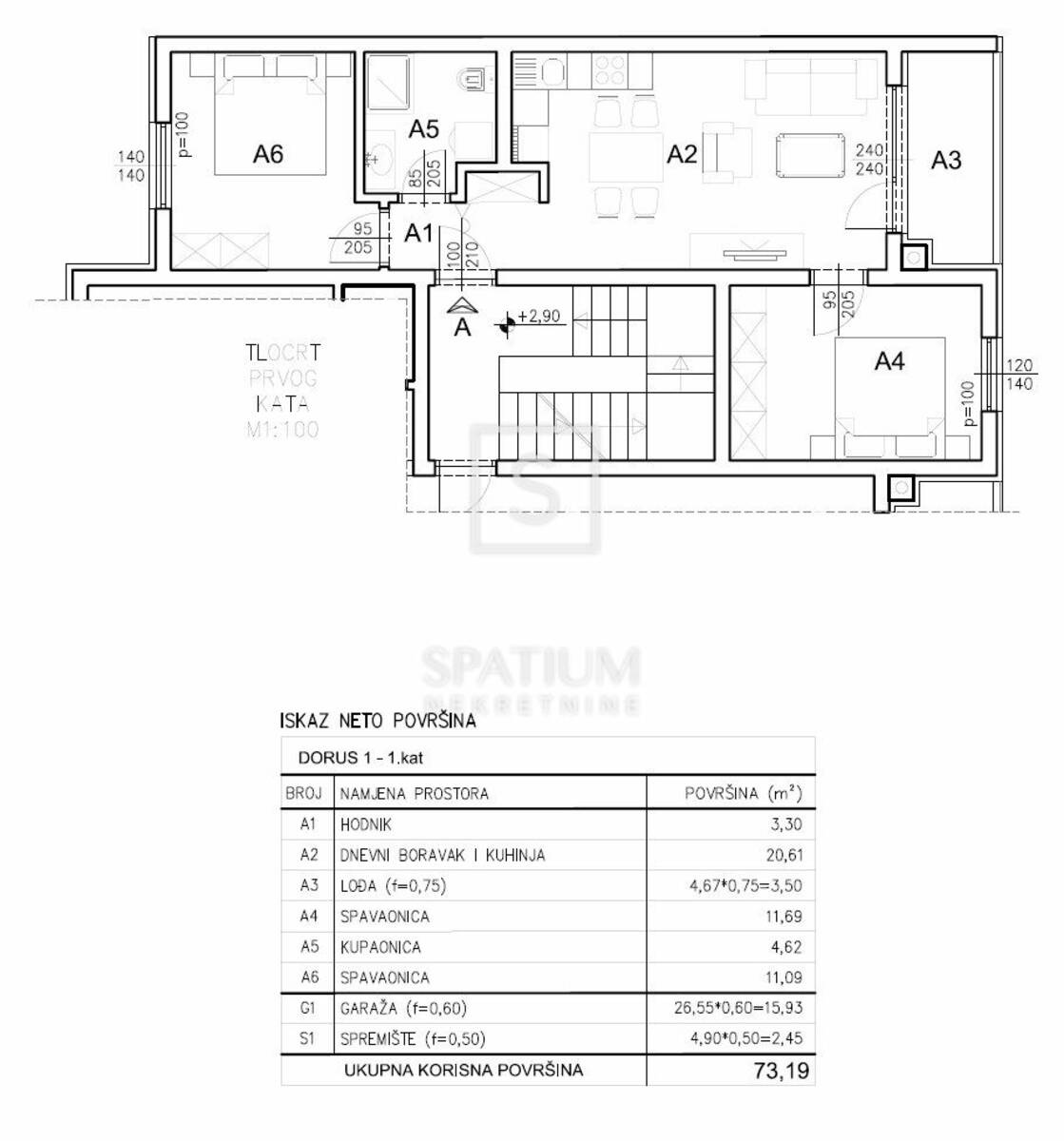 Stan se nalazi na prvom katu zgrade, ukupne neto površine od 73,19 m², uključujući stambeni dio, lođu, garažno parkirno mjesto i spremište u prizemlju. Stambena površina od 54,81 m² sastoji se od prostranog dnevnog boravka povezanog s kuhinjom i blagovaonicom, dvije spavaće sobe, kupaonice i hodnika, dok lođa pruža ugodan vanjski prostor za opuštanje. Stan je projektiran s naglaskom na optimalan raspored prostorija, obilje prirodnog svjetla i visoku razinu komfora, čineći ga idealnim za obiteljski život, ali i kao investiciju za dugoročni najam.