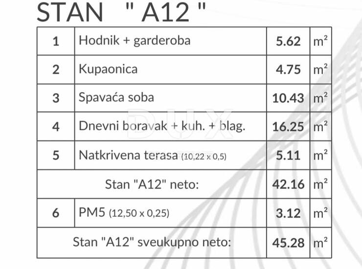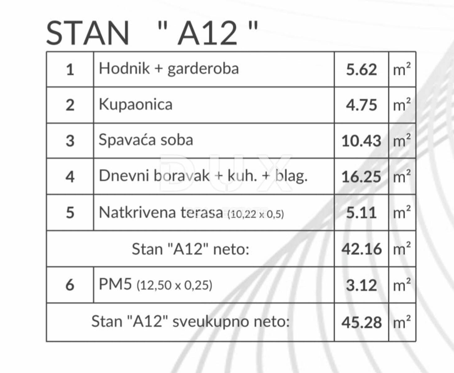 Na prodaju je moderan stan A12 u prizemlju koji se sastoji od ulaznog hodnika i garderobe, kupaonice, jedne spavaće sobe, dnevnog boravka, kuhinje i blagovaonice, natkrivene terase ukupne zatvorene površine od 42,16 m2 i parkirnog mjesta što stvara ugodan i funkcionalan prostor za svakodnevni život.