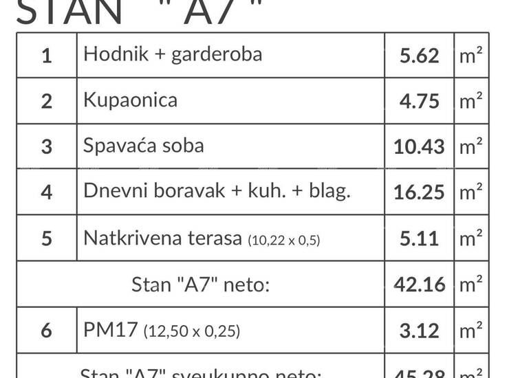 Stan A7, nalazi se na 1.katu zgrade i sastoji se od: hodnik+garderoba, dnevni boravak sa kuhinjom i blagovaonicom, 1 spavaće sobe, kupaonice i natkrivene terase. Stanu pripada jedno parkirno mjesto PM17 od 3,12 m2.