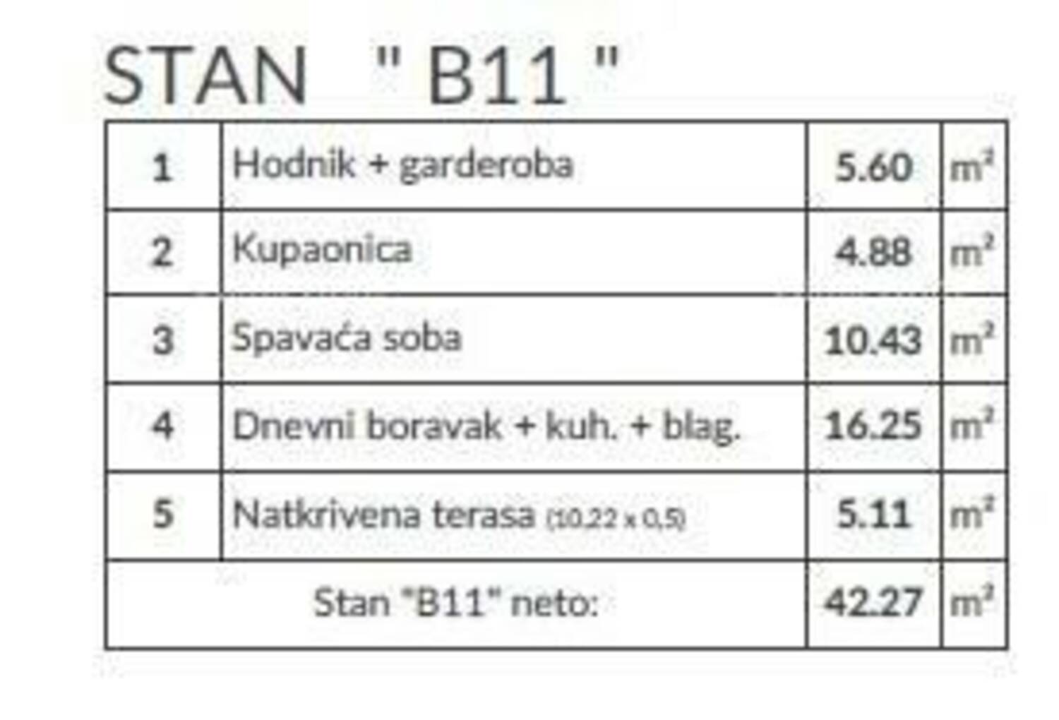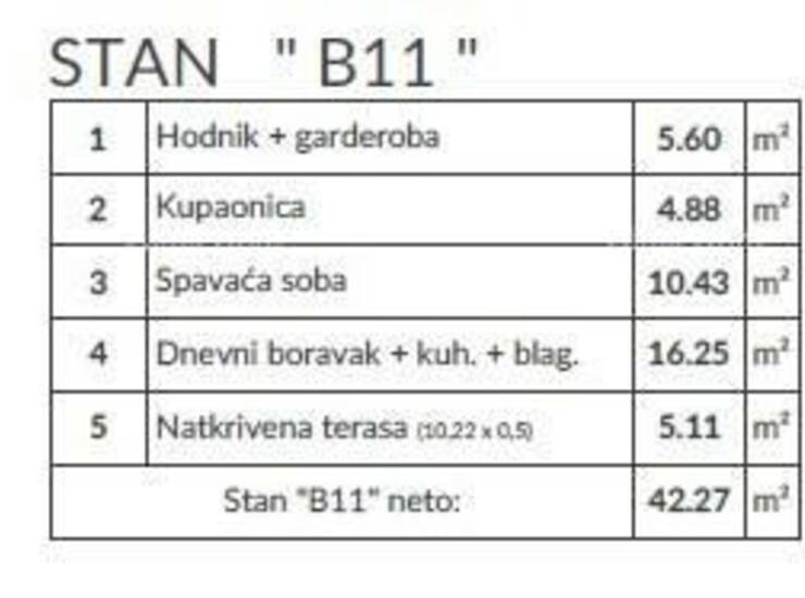 Stan B11, površine 42.27 m2, nalazi se na 2 katu zgrade i sastoji se od: hodnik+garderoba, dnevni boravak sa kuhinjom i blagovaonicom, spavaće sobe, kupatila i natkrivene terase.