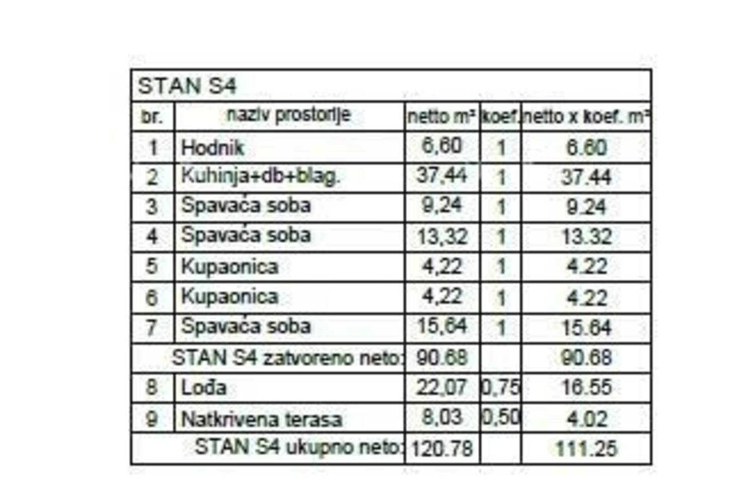 U ponudi je stan S4, smješten na 2.katu Zgrade 3 ima površinu 111,25 m² (90,68 m² zatvorenog prostora), s tri spavaće sobe (9,24 m², 13,32 m², 15,64 m²), dvije kupaonice, velikom dnevnom zonom (37,44 m²), hodnikom, lođom (22,07 m²) i natkrivenom terasom (8,03 m²). Ovaj stan nudi komfor i pogled koji savršeno upotpunjuje dojam modernog doma.