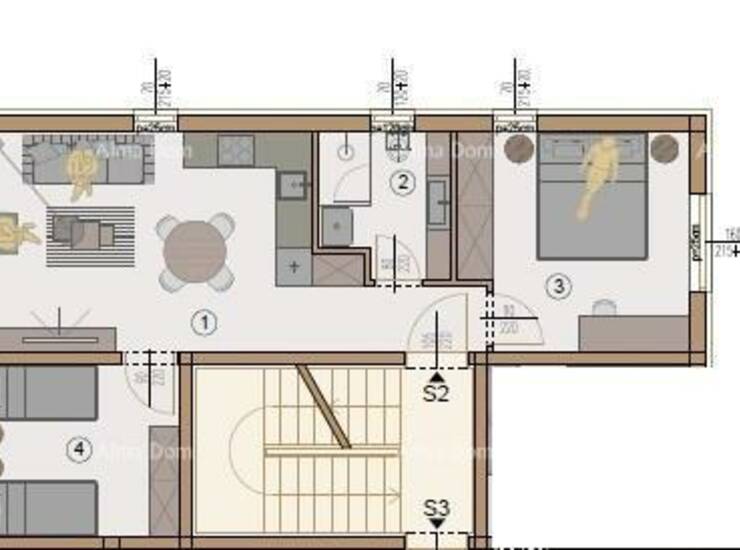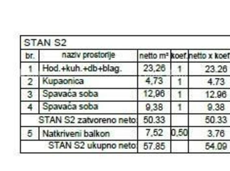 U ponudi je stan S2, smješten na prvom katu Zgrade 6 ima površinu 54,09 m2. Sastoji se od dnevne zone s kuhinjom i blagovaonicom, kupaonice, dvije spavaće sobe i natkrivene terase od 8,03 m². Ugodan, svijetao i funkcionalan.