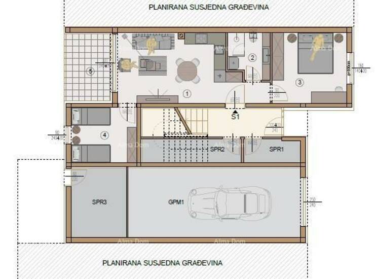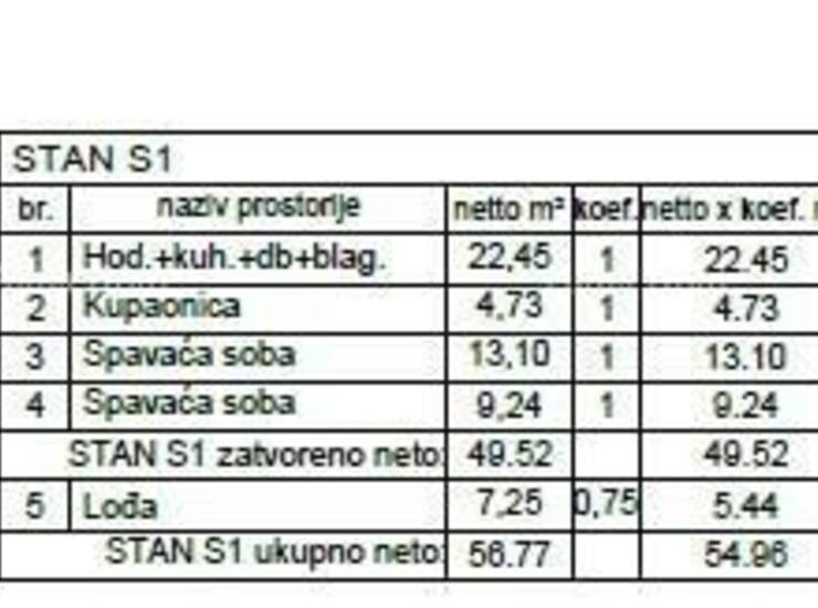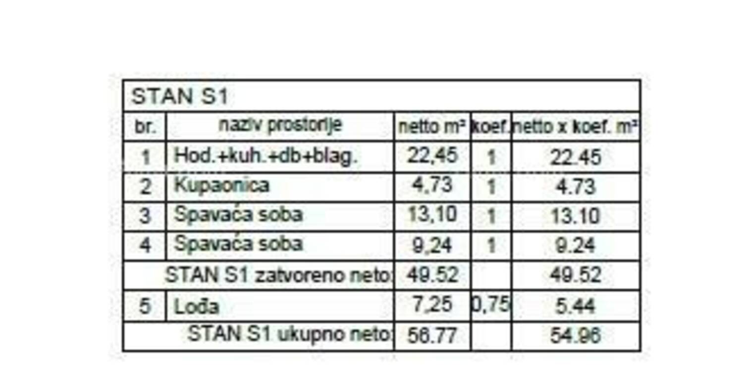 U ponudi je stan S1, smješten u prizemlju Zgrade 5 ima površinu 54,96 m² (49,52 m² zatvorenog prostora), s lođom od 7,25 m² i vrtom od 80 m². Raspored uključuje dnevnu zonu s kuhinjom i blagovaonicom (22,45 m²), dvije spavaće sobe i kupaonicu. Prizemni položaj i privatni vrt čine ovaj stan posebnim i ugodnim za obiteljski život.