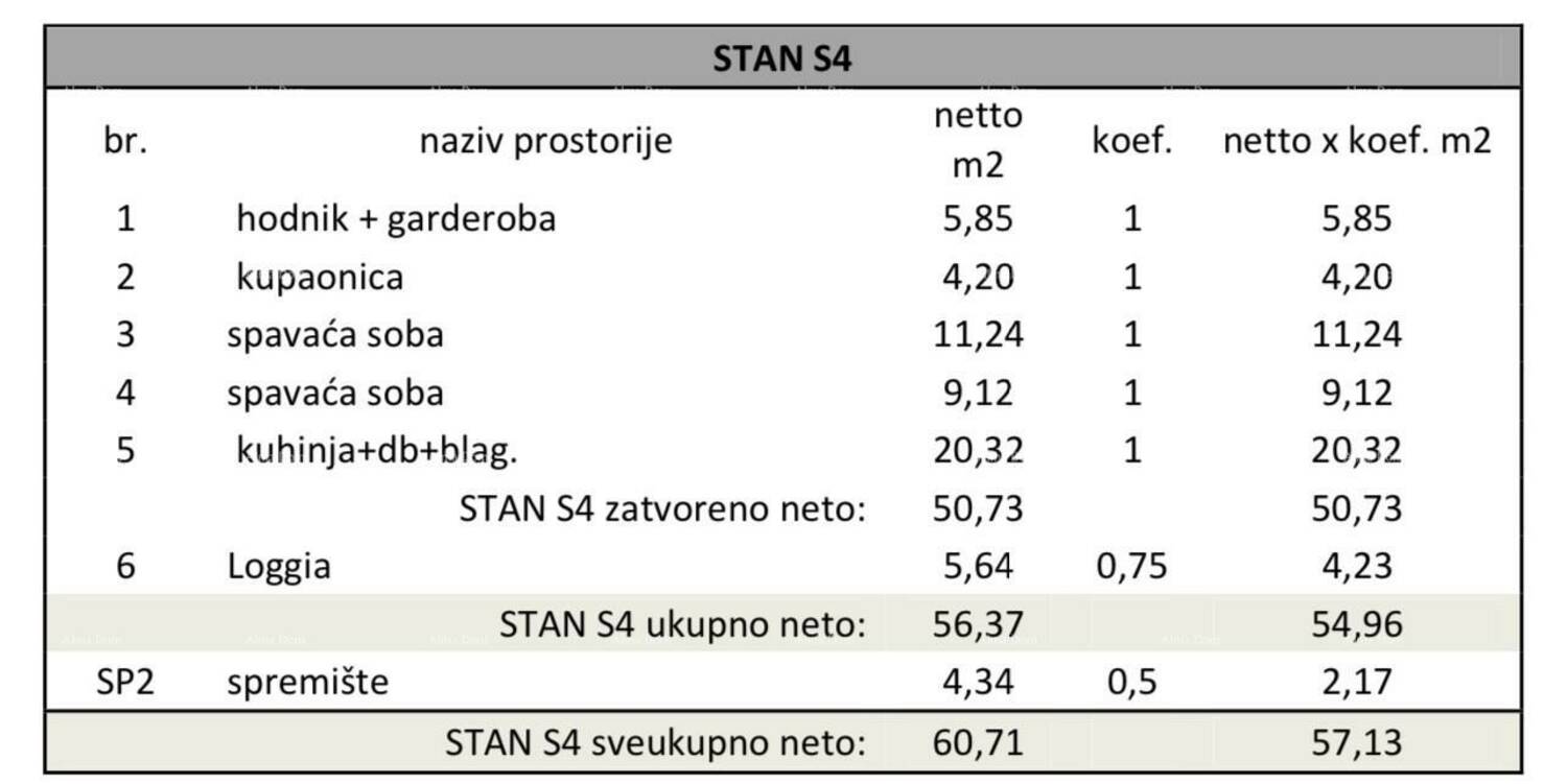 Stan se sastoji od ulaznog hodnika+garderoba, 2 spavaće sobe, kupaonice, kuhinje s blagavaonom te dnevnim boravkom i loggia ukupne površine 54.96.
