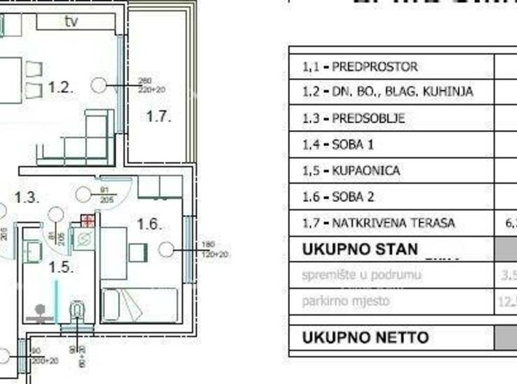 predprostora, dnevnog boravka s kuhinjom i blagovaonom, dvije spavaće sobe, kupaonice te terase.