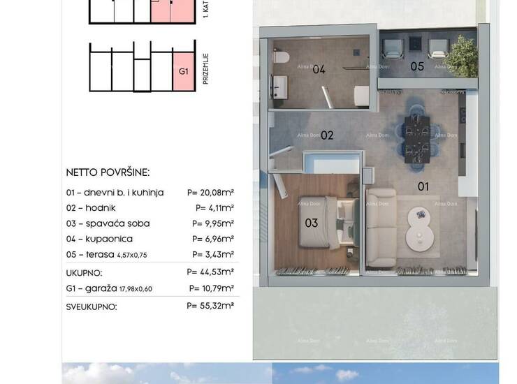 Stan neto površine 44,53 m2 i garaža.