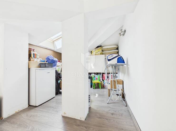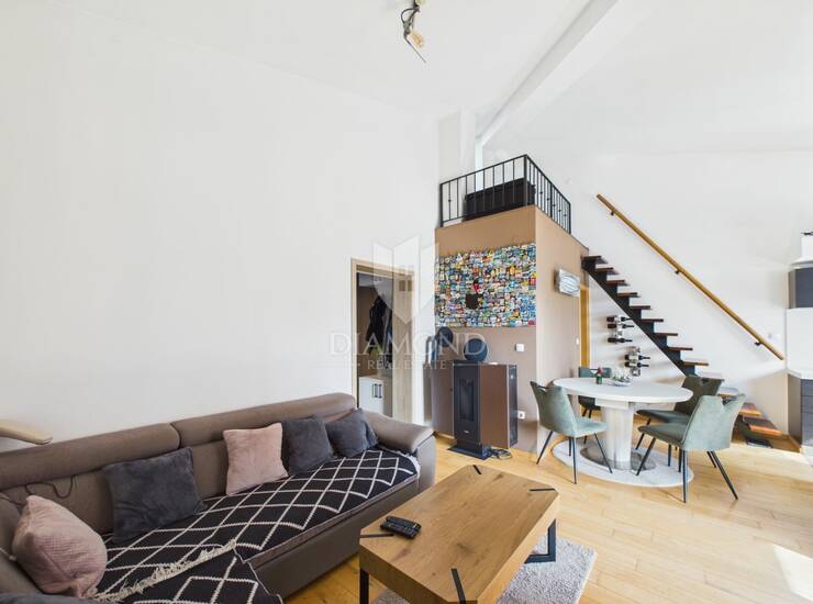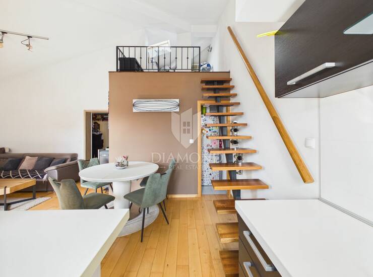 Stan je posebno zanimljiv zbog svojeg rasporeda i dojma prostora. Sastoji se od ulaznog hodnika, dvije spavaće sobe, kupaonice te otvorenog dnevnog dijela koji objedinjuje kuhinju, blagovaonicu i dnevni boravak u ugodnu i svijetlu cjelinu. Iz dnevnog prostora izlazi se na lijepu zatvorenu lođu koja pruža dodatni komfor i idealna je za jutarnju kavu, opuštanje ili boravak tijekom većeg dijela godine. Poseban adut ove nekretnine je galerija do koje vode stepenice iz dnevnog dijela. Budući da je dovoljno visoka za normalno stajanje, galerija se može koristiti kao dodatna spavaća soba, radni prostor, soba za goste ili mirna privatna zona unutar stana. Upravo taj detalj ovoj nekretnini daje dodatnu vrijednost i osjećaj kuće u stanu.