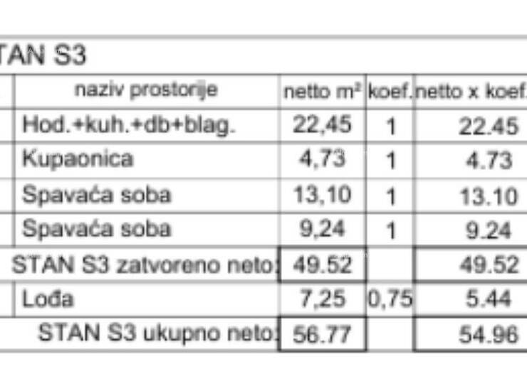 U ponudi je stan S3, smješten na prvom katu, ukupne površine 54,96 m². Stan se sastoji od: