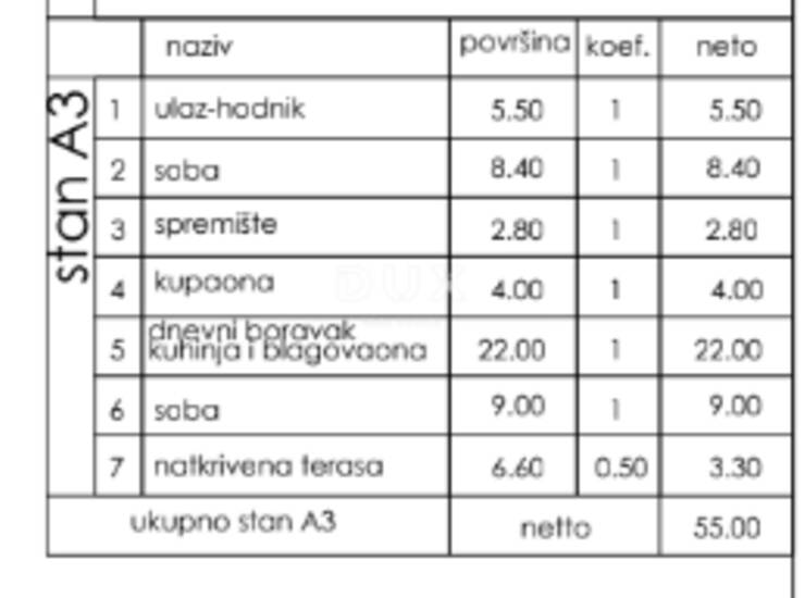 Predmetni stan nudi 55m2 stambenog prostora te mu pripada parkirno mjesto (2,75 m2- prema koeficijentu) , spremište 1 m2 ukupne površine 58,75m2