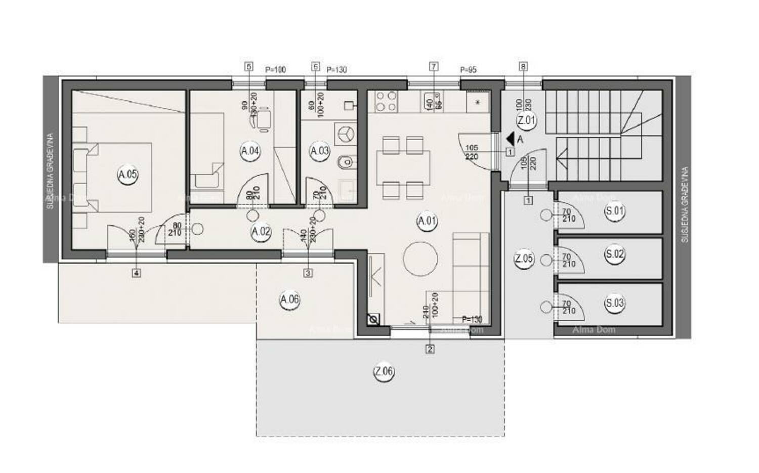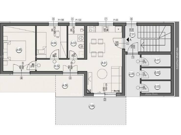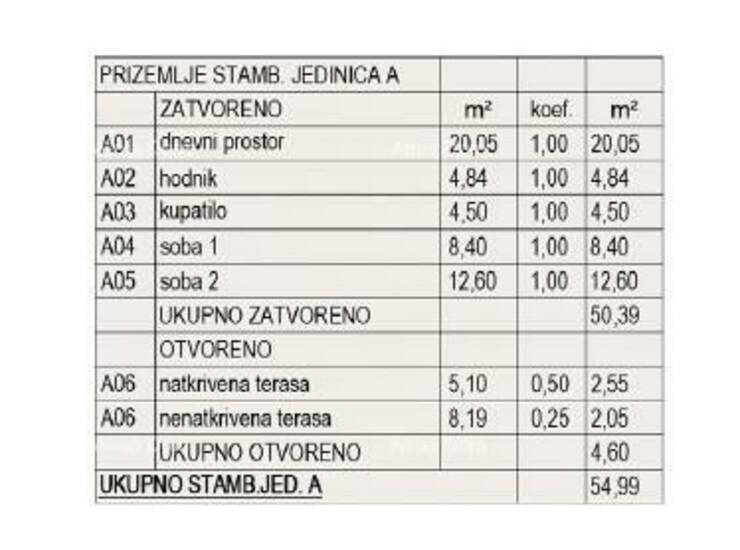 Stan A, nalazi se u prizemlju zgrade A2 i sastoji od: dnevnog prostora s kuhinjom i blagavaonom, 2 spavaće sobe, kupaone, hodnika, terase.