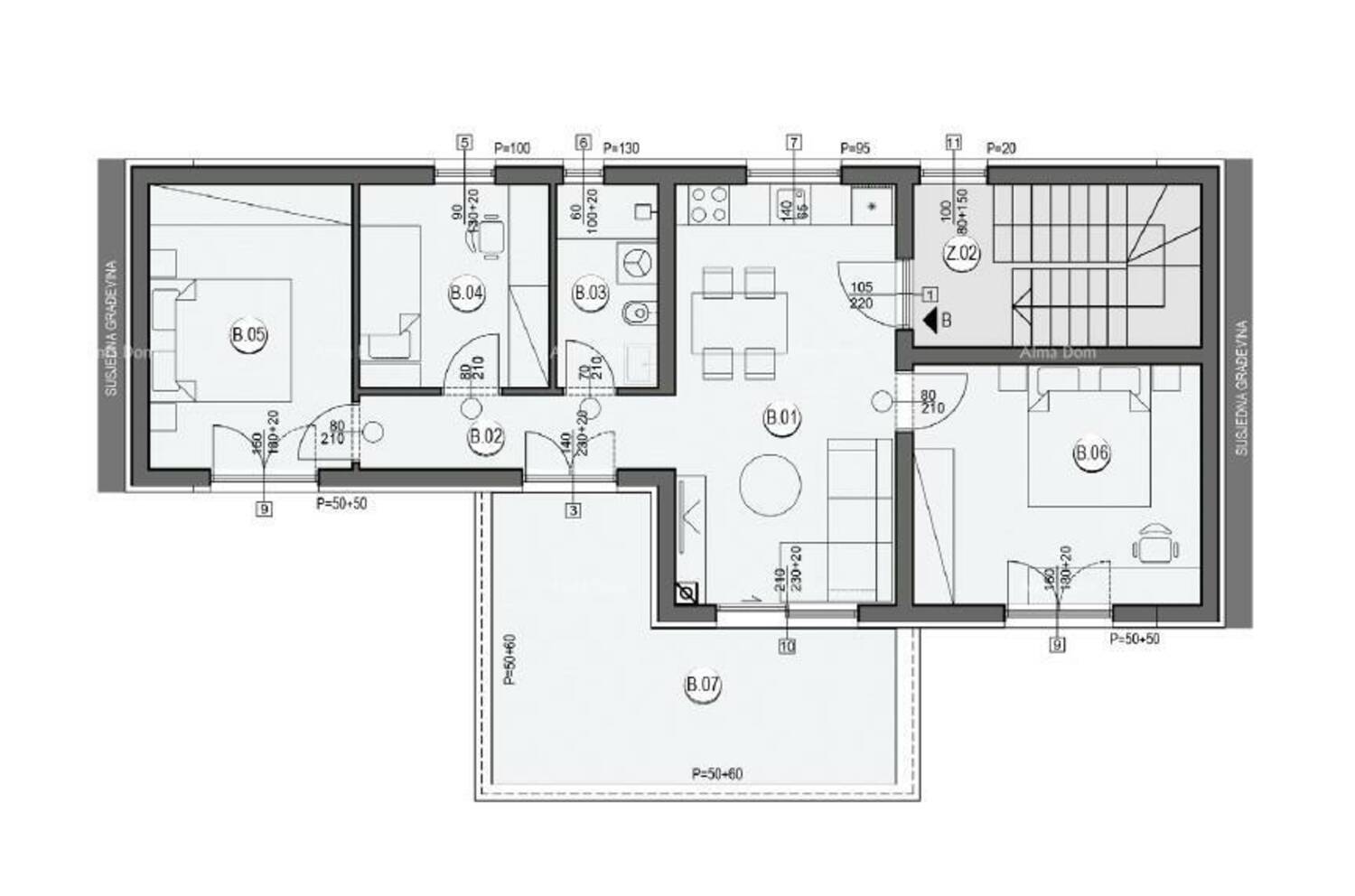 Stan B, nalazi se na 1.katu zgrade A2 i sastoji od: dnevnog prostora s kuhinjom i blagavaonom, 3 spavaće sobe, kupaone, hodnika, balkona.