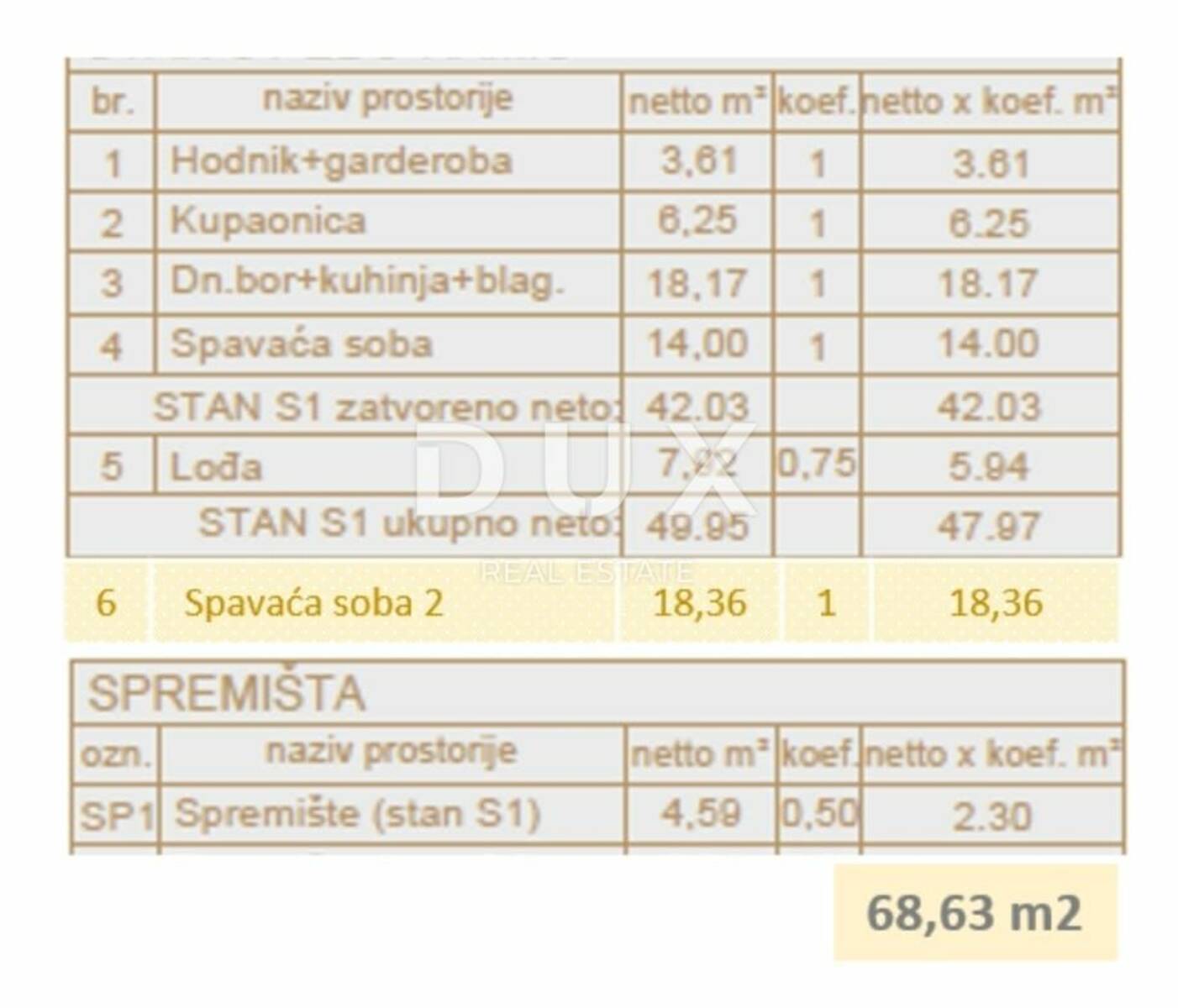 Tako u ponudi imamo dvosobni stan u prizemlju površine 68,63m2 a sastoji se od hodnika sa garderobom, kupaonice, dnevnog boravka, kuhinje sa blagovaonicom, dvije velike spavaće sobe i lođe.