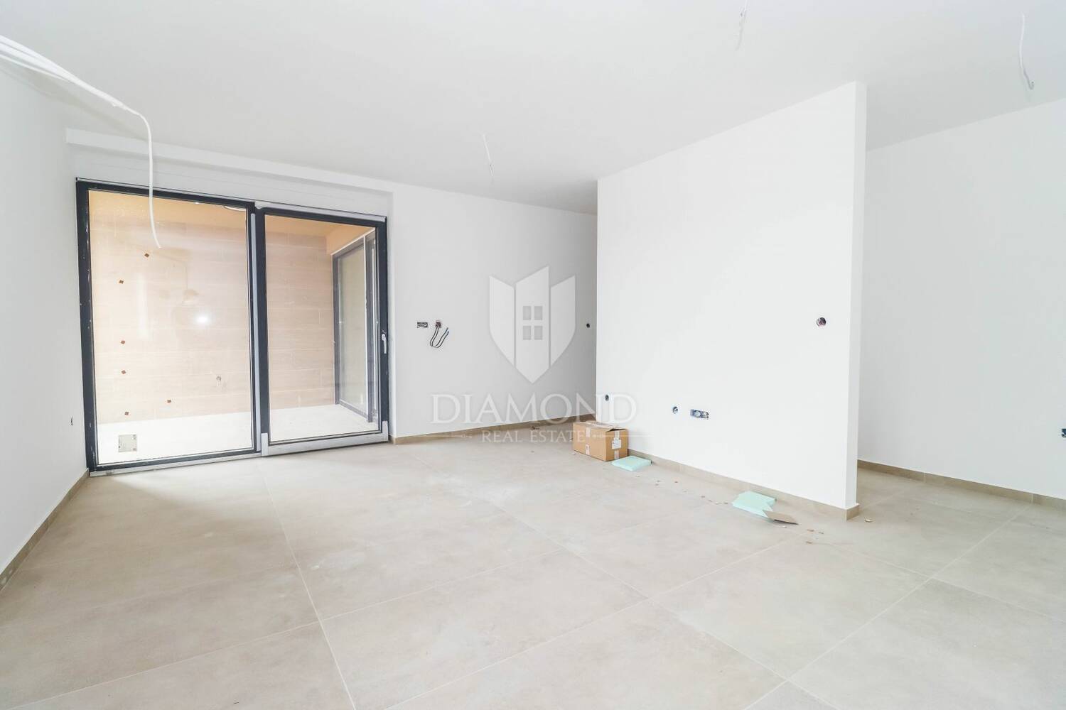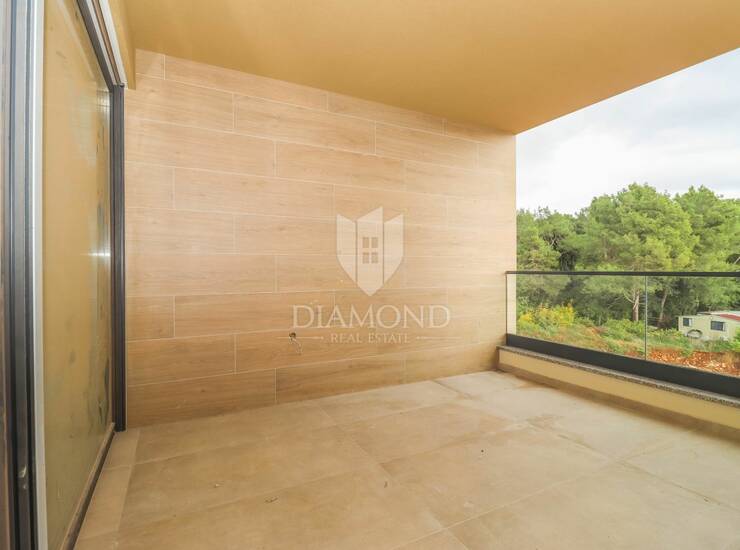 Stan se nalazi na trećem katu moderne stambene zgrade koja je dio novog kompleksa. Zgrada je u završnoj fazi gradnje – izvode se završni radovi, što budućem vlasniku omogućuje da već sada planira useljenje nakon ishođenja uporabne dozvole i organizira uređenje interijera po vlastitom ukusu. Ukupna neto korisna površina stana iznosi cca 83,20 m². Tlocrtno je odlično organiziran i sastoji se od ulaznog hodnika, kupaonice, ostave, dvije spavaće sobe te prostranog open-space dnevnog dijela u kojem se nalaze kuhinja, blagovaonica i dnevni boravak. Iz dnevnog boravka izlazi se na djelomično natkrivenu terasu koja je poseban adut ove nekretnine. Terasa je dovoljno prostrana za blagovaonski stol i lounge kutak, savršena za jutarnju kavu uz pogled na zelenilo, rad od kuće na otvorenom ili druženja s obitelji i prijateljima. Okruženost šumom i udaljenost svega nekoliko minuta vožnje do plaže pružaju rijetko spojiv osjećaj privatnosti, prirode