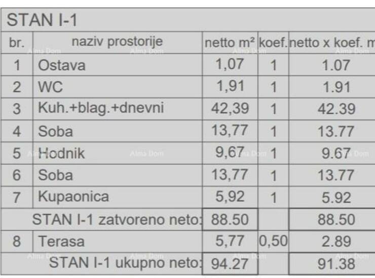 Stan l1, nalazi se na 1. katu zgrade, ukupne kvadrature 91,38m2, a sastoji se od: hodnika, kuhinje, dnevnog boravka i blagovaonice, ostave, 2 spavaće sobe, toaleta, kupaonice i terase. Grijanje/hlađenje stana će biti osigurano uz klima uređaje Mitsubishi i podno grijanje.