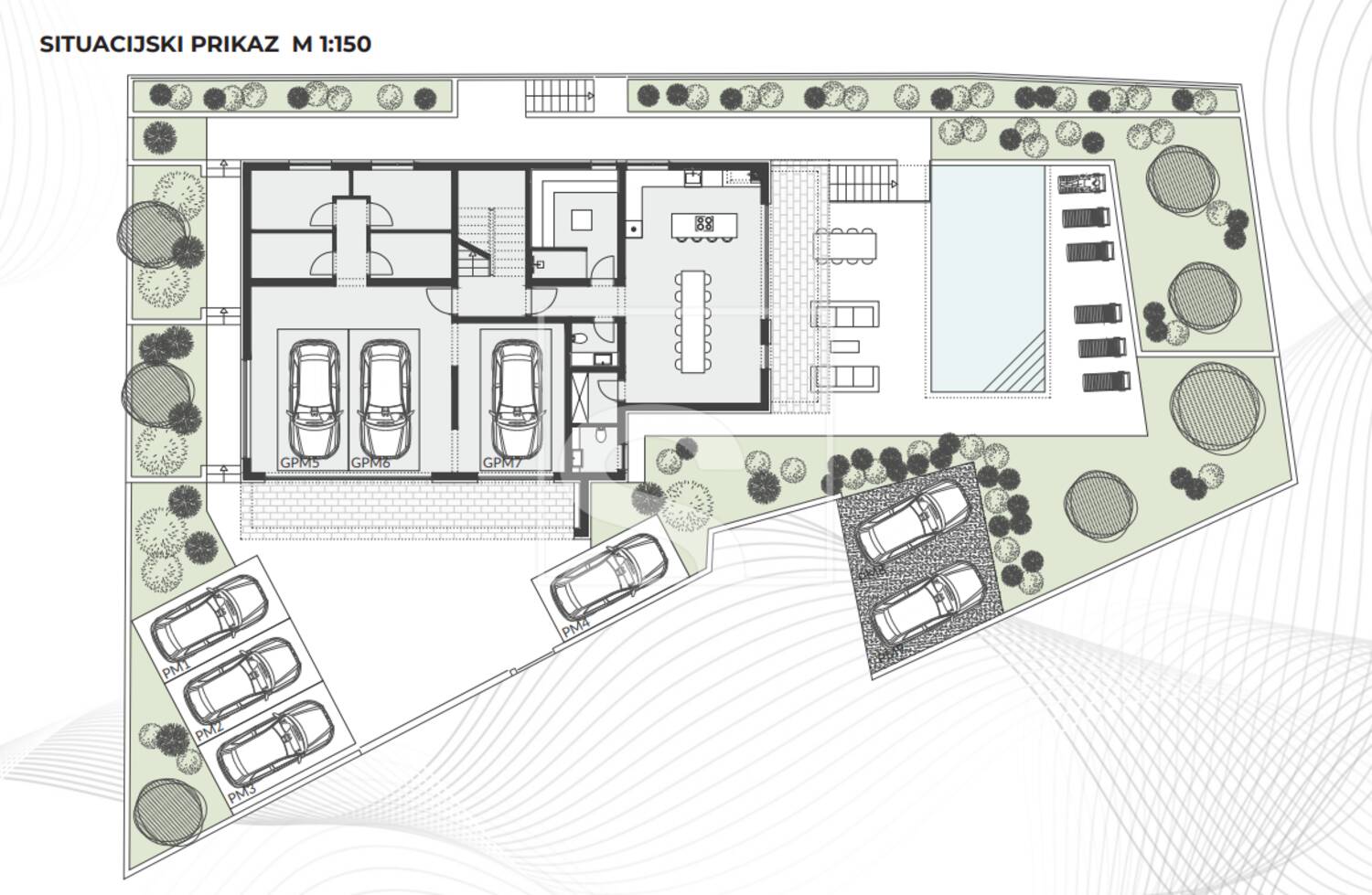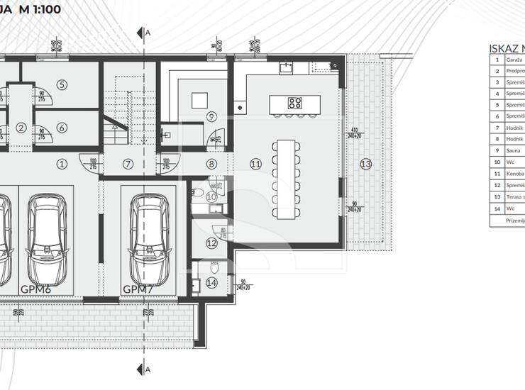 Tri garažna parkirna mjesta, četiri komotna spremišta (za svaki stan po jedno), hodnik sa stubištem, dva odvojena WC-a, saune te prostrane konobe. Ukupna površine prizemlja = 178.80m2