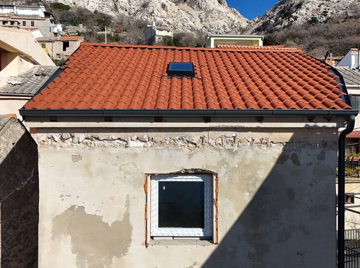 Na samo 60 metara od prelijepih plaža odnosno par minuta hoda po uskim ulicama Stare Baške, smjestila se jedna od rijetkih samostojećih kuća u selu, izgrađena 1903. godine. Temeljita obnova već je započeta, uklonjenje su stare međukatne drvene konstrukcije i napravljene su nove betonske. Postavljena je nova PVC stolarija, novi krov (mediteran crijep) sa krovnim prozorom, napravljeni su pregradni zidovi i razvučena je struja po cijeloj kući. Postoji priključak za vodu, koju tek treba provući kroz etaže. Slijede manje zahtjevni radovi na kući.